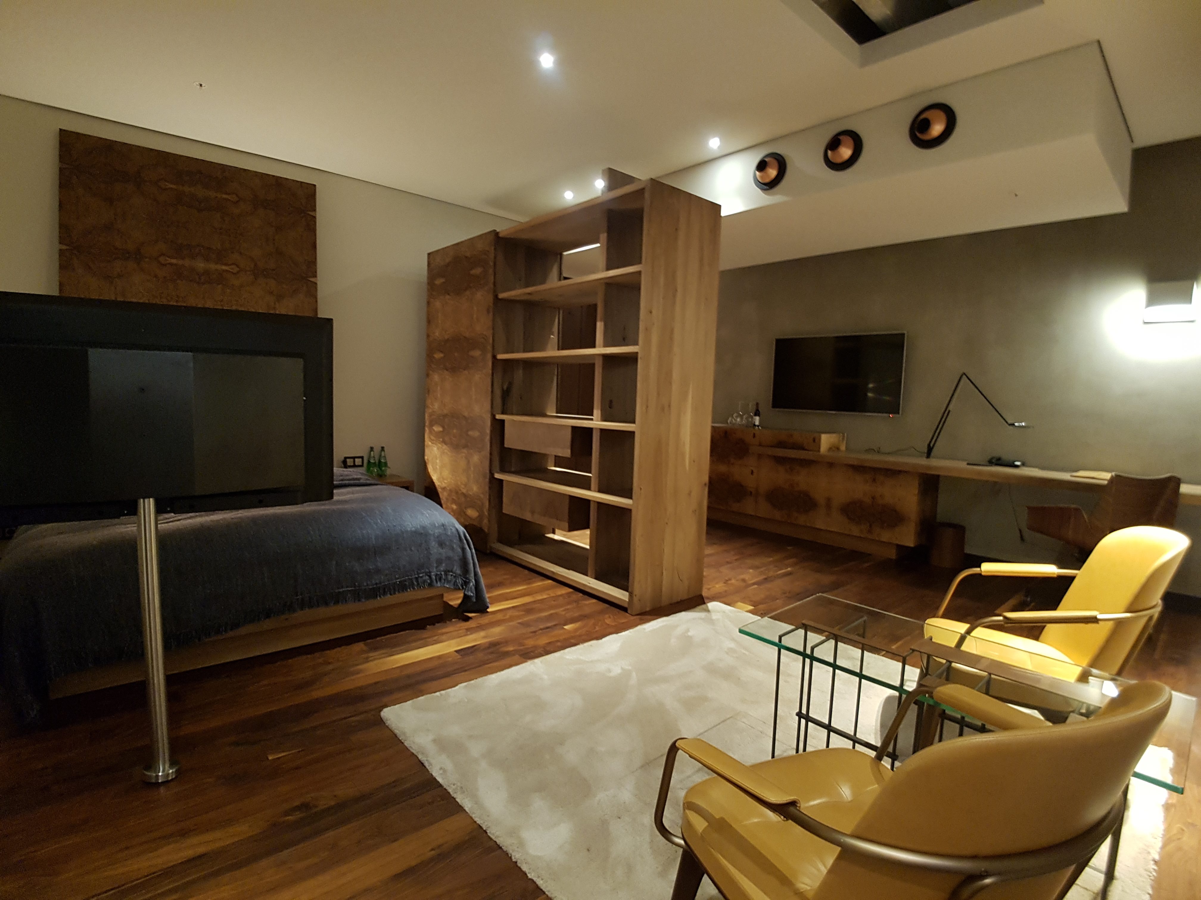 Po lewej stronie pokoju znajduje się część salonowa, którą można określić również jako dzienną czy wypoczynkową. Tutaj znajdziemy zwieńczenie ściany w postaci rozciągającego się na całej jej długości blatu – biurka, w towarzystwie stosownego krzesła. Po środku pokoju znajdziemy wielką skórzaną kanapę, złożoną z mniejszych części, które łatwo można zaaranżować według własnego pomysłu. Towarzyszą jej dwa szklano – metalowe stoliki kawowe ustawione na rozpostartej na drewnianej podłodze skórze zwierzęcej. Dalej, pełniąca rolę elementu dzielącego przestrzeń dzienną a nocną, wielka szafa, pełna półek, wieszaków i innych elementów ułatwiających przechowywanie przedmiotów. Część szafy to elementy zamykane, inna zaś to półki ciągnące się wzdłuż ściany i biegnące niemal do drzwi wejściowych pokoju.