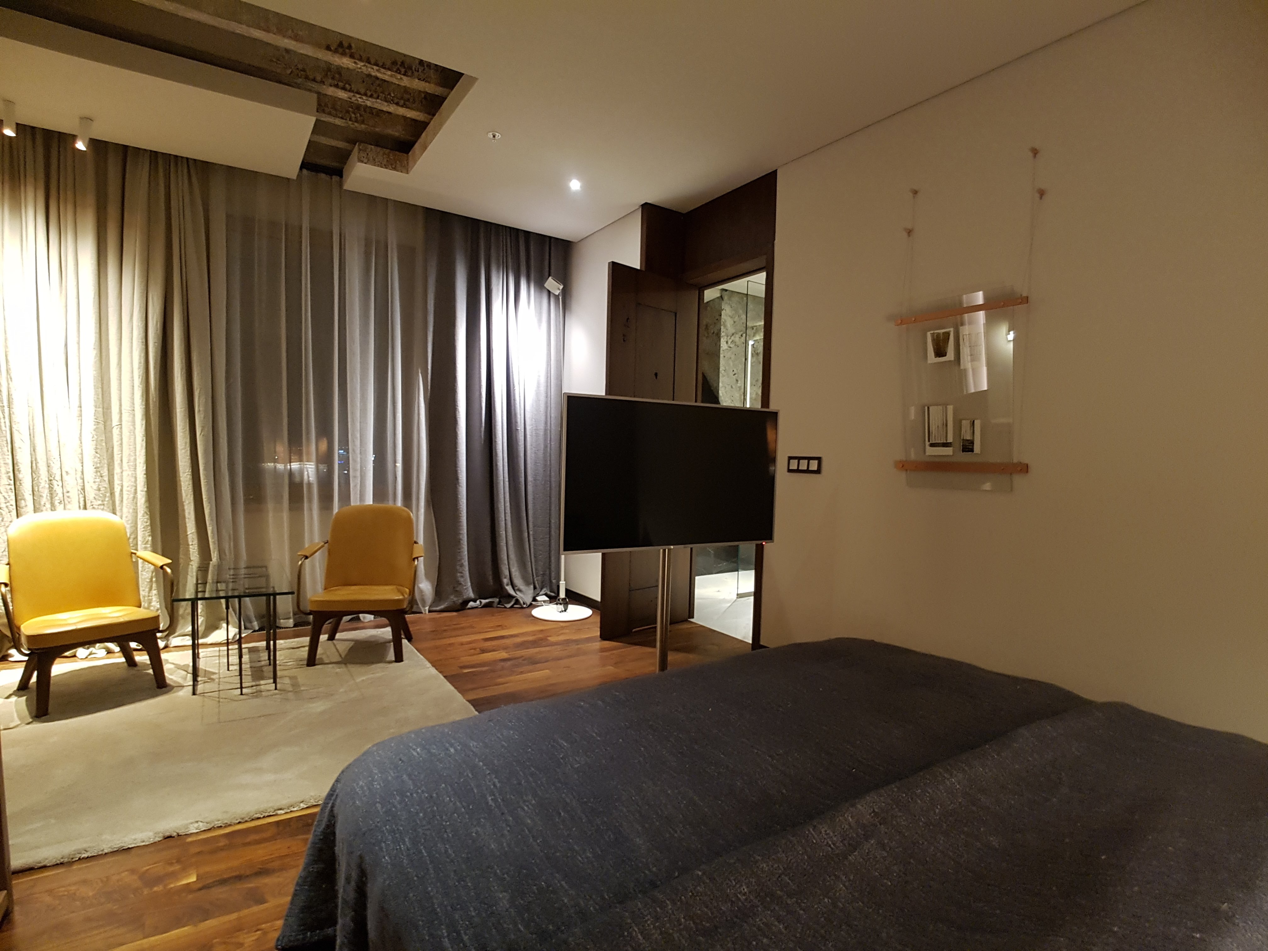 Przykładanie wielkiej wagi do formy i wyglądu hotelu jako całości, a przez to w odpowiedniej skali również poszczególnych pokoi i apartamentów widać na każdym kroku. Niestety, na ołtarzu estetyki w wielu przypadkach poświęcono również funkcjonalność. Koronnym przykładem tego typu podejścia jest fakt, że próbując popracować przy wydawać by się mogło stworzonym do tego celu blacie-biurku w naszym pokoju, nie byliśmy w stanie znaleźć żadnego miejsca, w którym moglibyśmy podłączyć ładowarki naszych komputerów. Spotkaliśmy się już z wieloma sprytnymi „schowkami” na różnego rodzaju gniazda, które miały pomóc zachować estetykę pomieszczenia czy mebla, więc i tym razem nie daliśmy łatwo za wygraną. Poprosiliśmy nawet o pomoc pracownicę hotelu, ale i ona nie mogła znaleść odpowiedniego miejsca z dostępem do prądu. Przy okazji zgłosiliśmy również awarię działania minibaru w naszym pokoju. Pani Kasia, która przyszła nam z pomocą była nieco zdziwiona sytuacją braku gniazd w okolicy biurka, ale nie poddała się łatwo – poszukiwała rozwiązania naszego problemu tak długo, aż udało nam się je wspólnie znaleźć. Niestety, wiązało się to z wizytą w innym pokoju, gdzie okolice biurka były dużo lepiej przystosowane do pracy z elektronicznymi gadgetami. Tym samym mieliśmy szansę zobaczyć jak wygląda junior suite o numerze pokoju 1101. Sam pokój, mimo, że znacznie mniejszy od naszego, wydawał się bardzo przyjemny, poza jednym, ale bardzo znaczącym elementem. Dziwny sposób montażu telewizora nie wydał nam się ani funkcjonalny, ani estetyczny, ani tym bardziej pasujący do tego wnętrza.