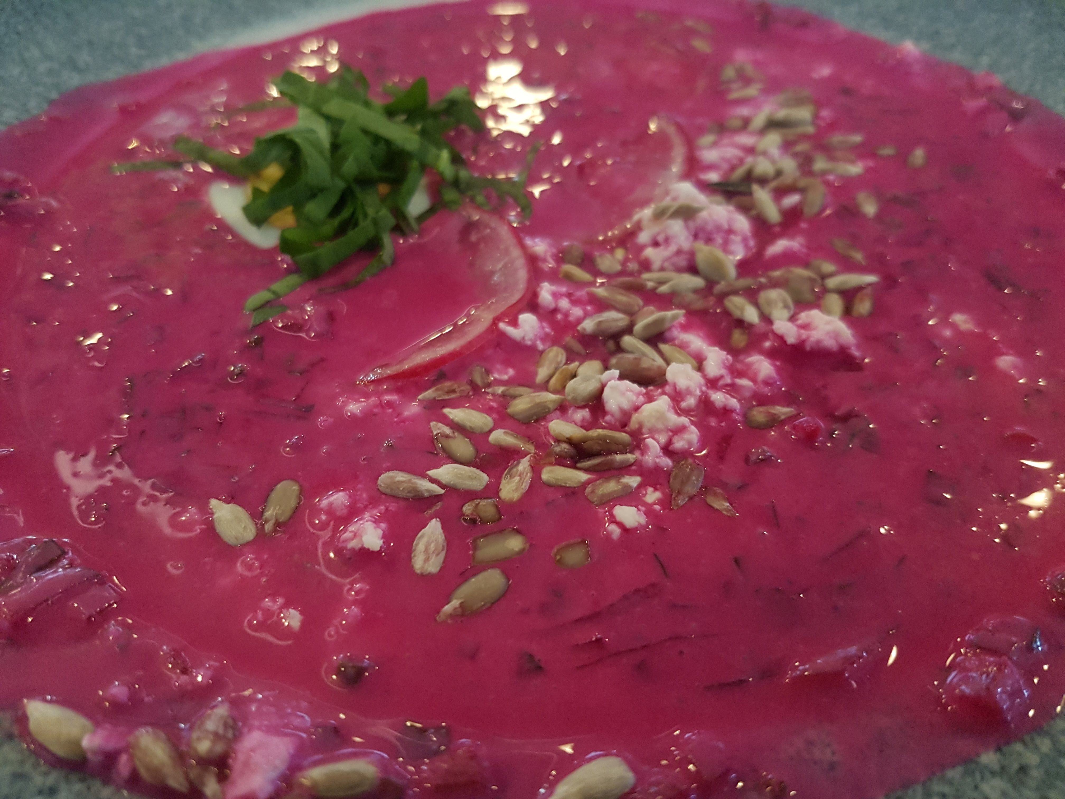 Chłodnik – zupa serwowana na zimno, niemal wylewała się z talerza. Pełna była pysznego sera oraz kawałków świeżej botwinki. Słodkawy smak zupy wspaniale podkreślały pestki słonecznika.