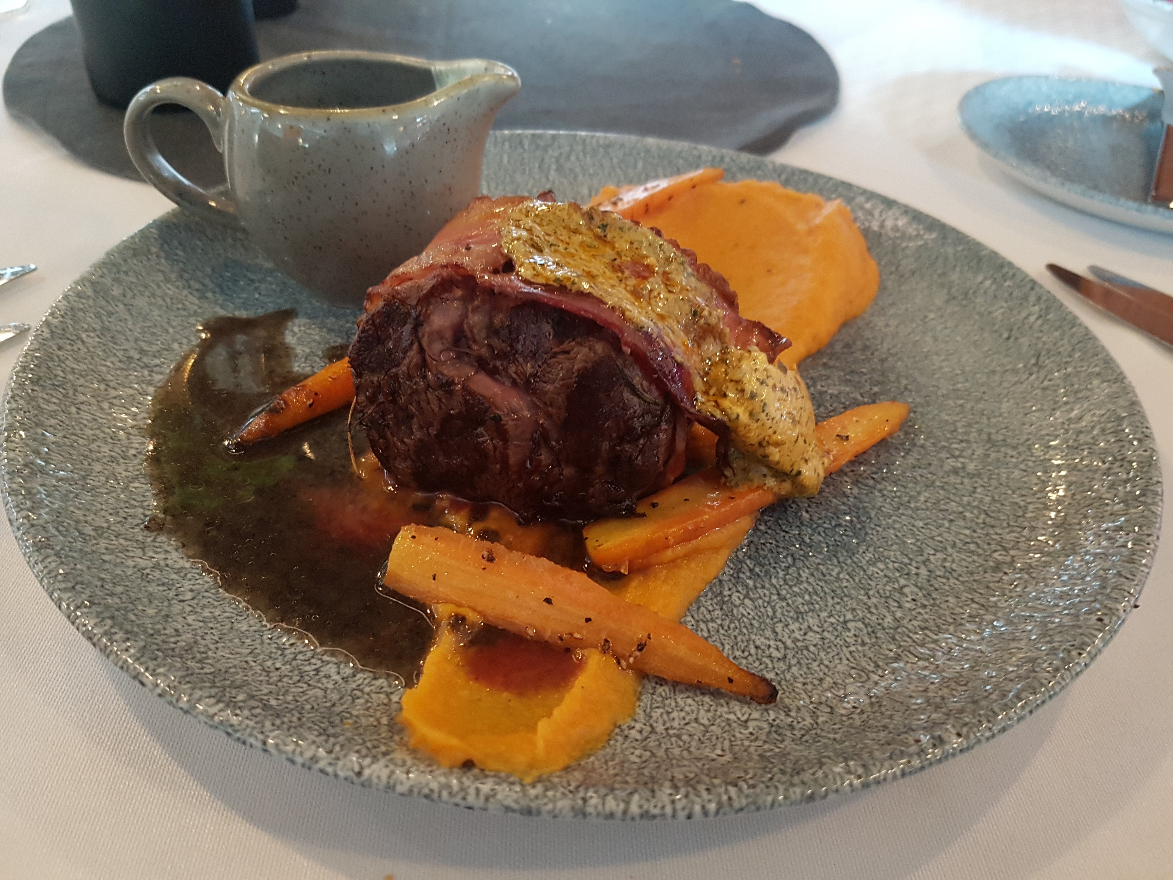 Stek – wysmażony zgodnie z zamówieniem (medium rare), otoczony bekonem z dodatkiem masła czosnkowego, rozpływał się w ustach. Słodkie puree z batatów oraz jędrne i kruche marchewki świetnie równoważyły się z gęstym, aromatycznym sosem.