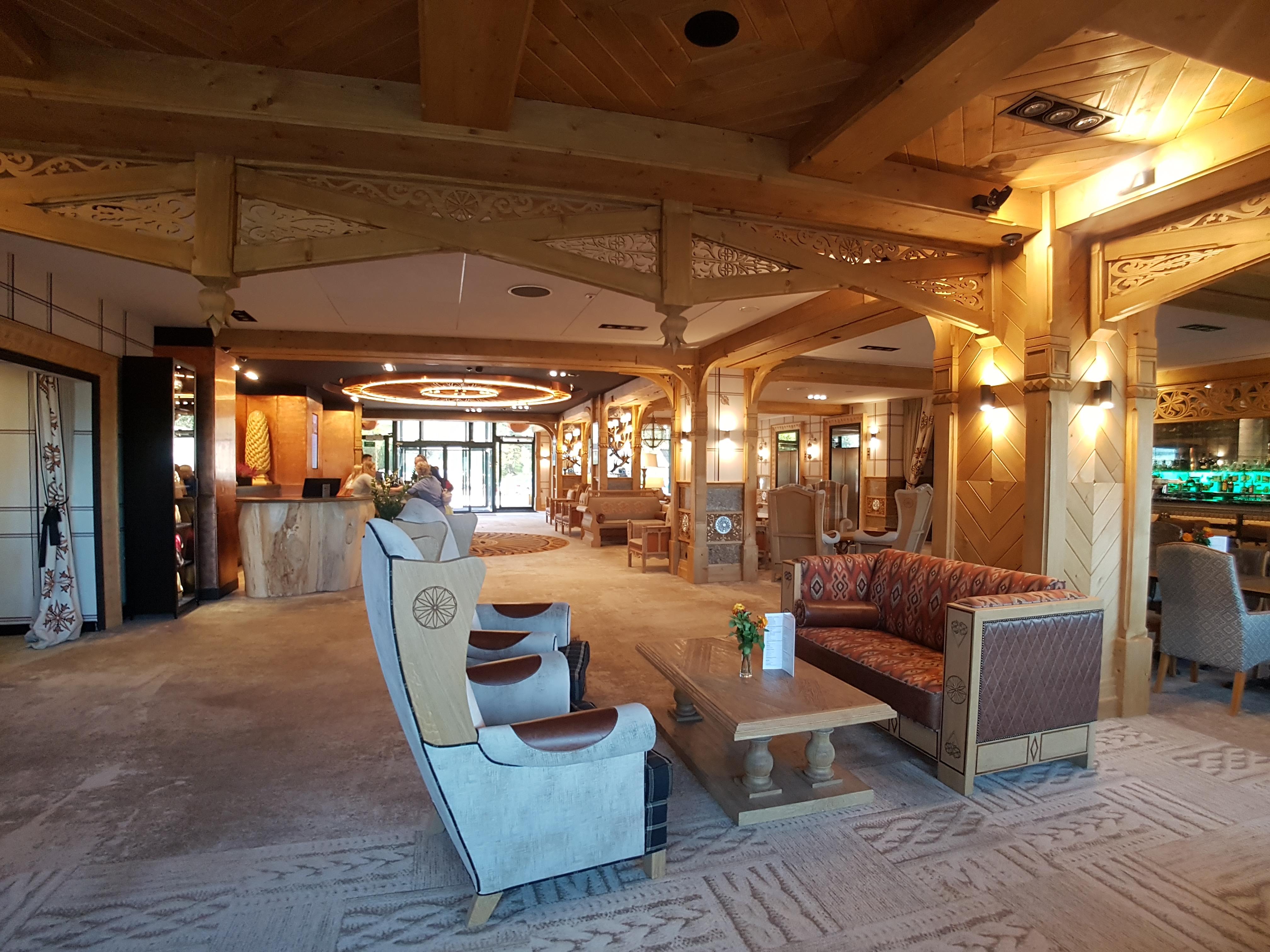 W hotelu kończy się właśnie konferencja medyczna i w lobby panuje duże zamieszanie związane z wymeldowaniami i wyjazdami gości. Gdy tylko przekraczamy główne drzwi obiektu, mamy wrażenie, jakbyśmy trafili do innej krainy, po drugiej stronie lustra. Odnajdujemy tu zdecydowanie góralski charakter hotelu. Jest dużo drewna, kominek oraz meble z tapicerką w ciepłych kolorach. Nawet dywany, którymi wyłożono podłogę w praktycznie całym lobby pozytywnie nas zaskakują. Większość gości hotelowych z pewnością nie raz z trudem prowadziło swoje walizki po miękkich dywanach. W Mercure Kasprowy Zakopane nic takiego nie ma miejsca. Walizki bardzo lekko suną po hotelowej podłodze.