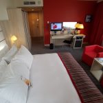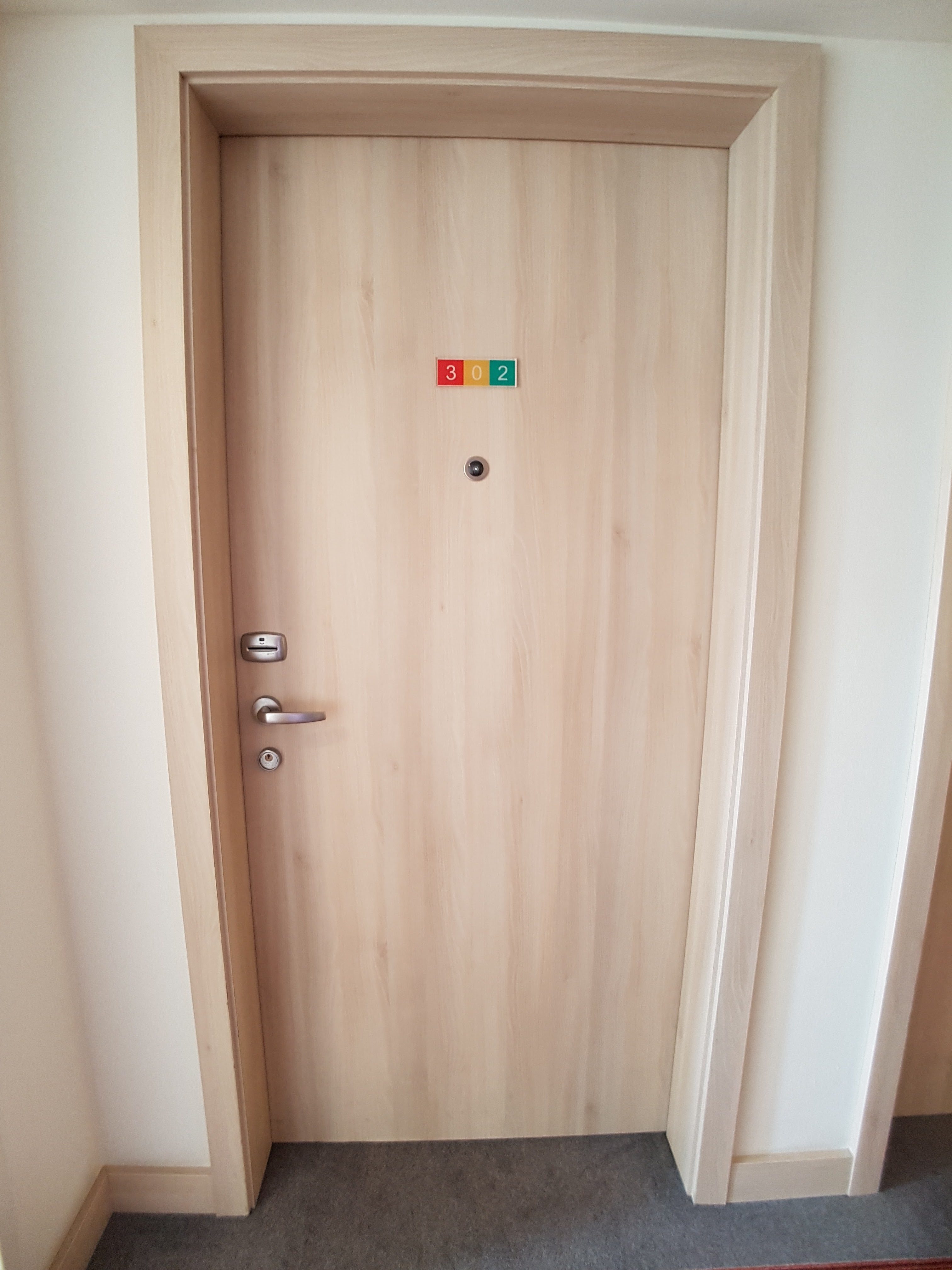 Pokój 302, znajduje się na końcu jednego z korytarzy trzeciego piętra. Jest on nieco większy niż inne pokoje, w których nocowaliśmy w Park Inn Kraków. Głównym elementem, poza nieco większymi rozmiarami, które czynią go apartamentem junior, jest ilość okien – pokój znajduje się u zbiegu dwóch szczytowych ścian budynku hotelu. Dodatkowym atutem tego miejsca jest również widok na Wawel w oddali. Inne wyróżniki apartamentu junior? Lodówka, która nie jest standardem w pokojach hoteli Park Inn, podobnie jak ekspres do kawy. Na uwagę zasługuje też łazienka – większa niż w innych pokojach, z dwoma umywalkami, oraz pełnowymiarową wanną i osobnym prysznicem. Takie rozwiązania również nie są standardowe dla pokoi podstawowych w hotelach tej marki. Reszta pokoju nie zaskakuje – łóżko, szafa, biurko, dwa fotele, stolik.