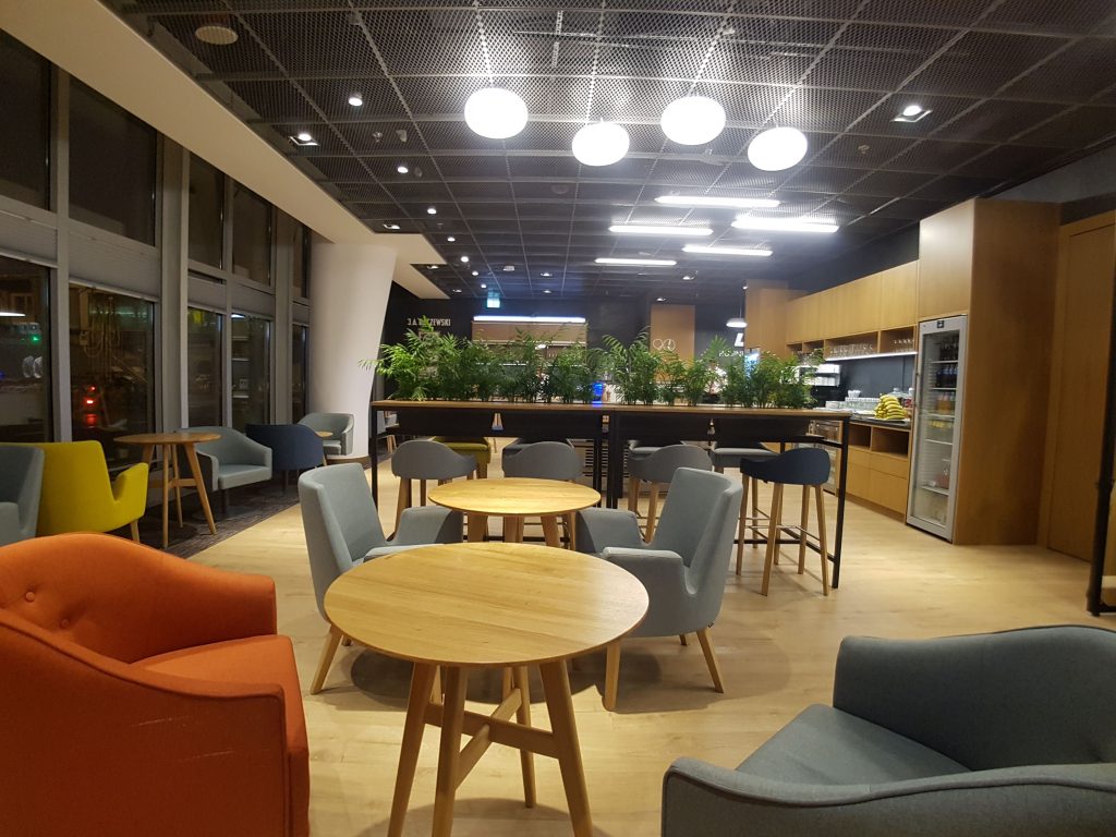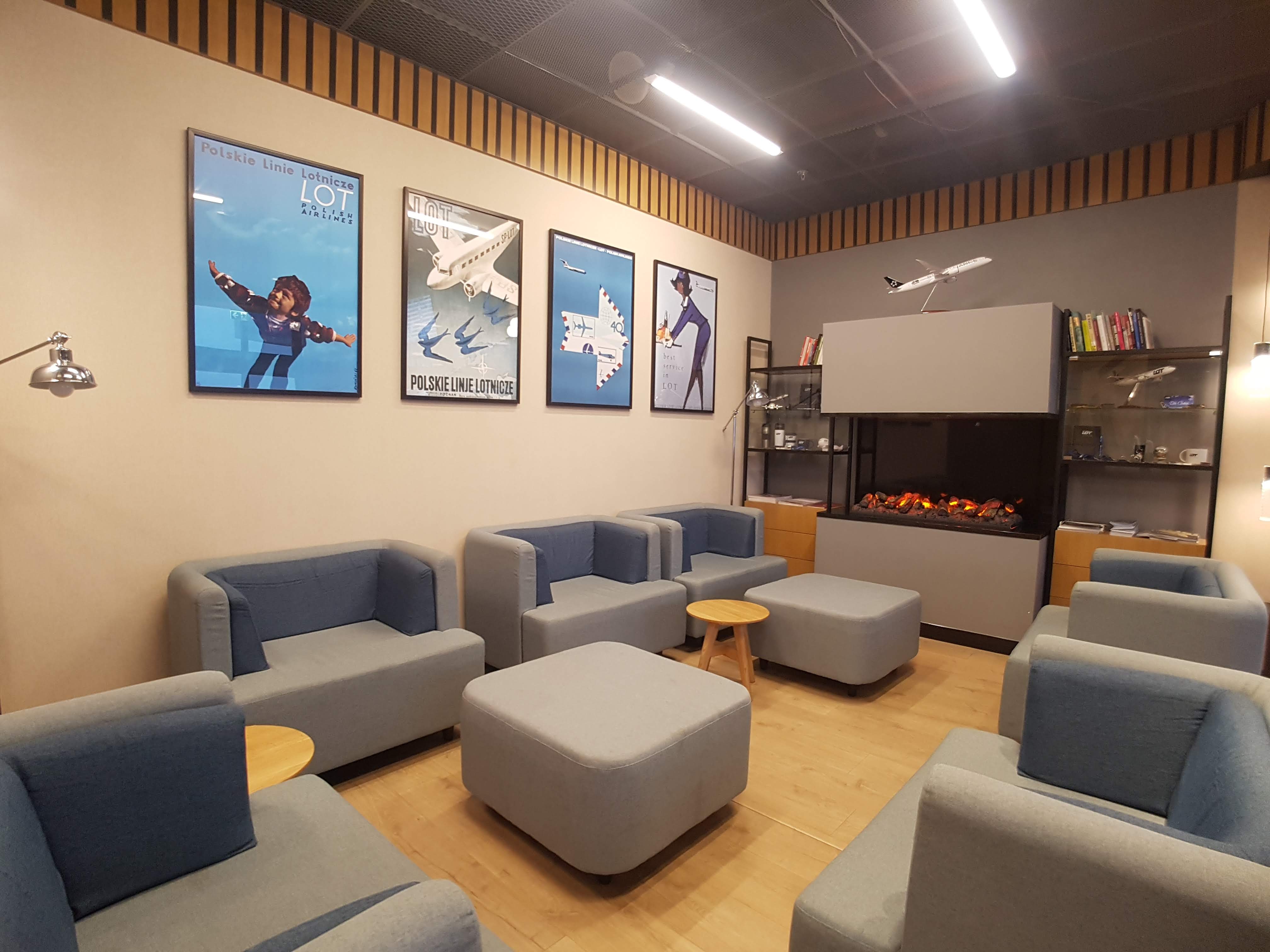 Część bufetowa oddzielona została od strefy wypoczynkowej doniczkami z wysokimi roślinami. W części wypoczynkowej znajdziemy różne konfiguracje kanap i foteli ze stolikami kawowymi. Jest też kącik z elektrycznym kominkiem oraz gabloty z akcesoriami brandowanymi znakiem LOTu.