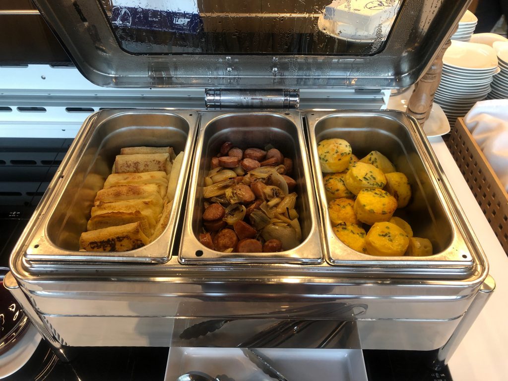 Na lewo od wejścia znajduje się bufet z przekąskami i napojami oraz wyspa z daniami ciepłymi w bemarach i zimnymi na półmiskach. W części bufetowej znajdziemy wysokie stoliki, przy których można skosztować przygotowanego jedzenia. W trakcie naszych, głównie porannych wizyt, z dań ciepłych do wyboru były naleśniki, kiełbaski i gofry. Całość uzupełniała oferta dań zimnych, czyli talerze wędlin, ryb, serów, oraz warzywa. Przez cały dzień dostępne są owoce oraz słodkie i słone przekąski.