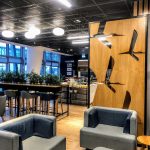 Podoba nam się wykorzystanie akcesoriów i memorabilii LOTu w tym miejscu, a drewniana ściana z Żurawiem – symbolem przewoźnika jest super.