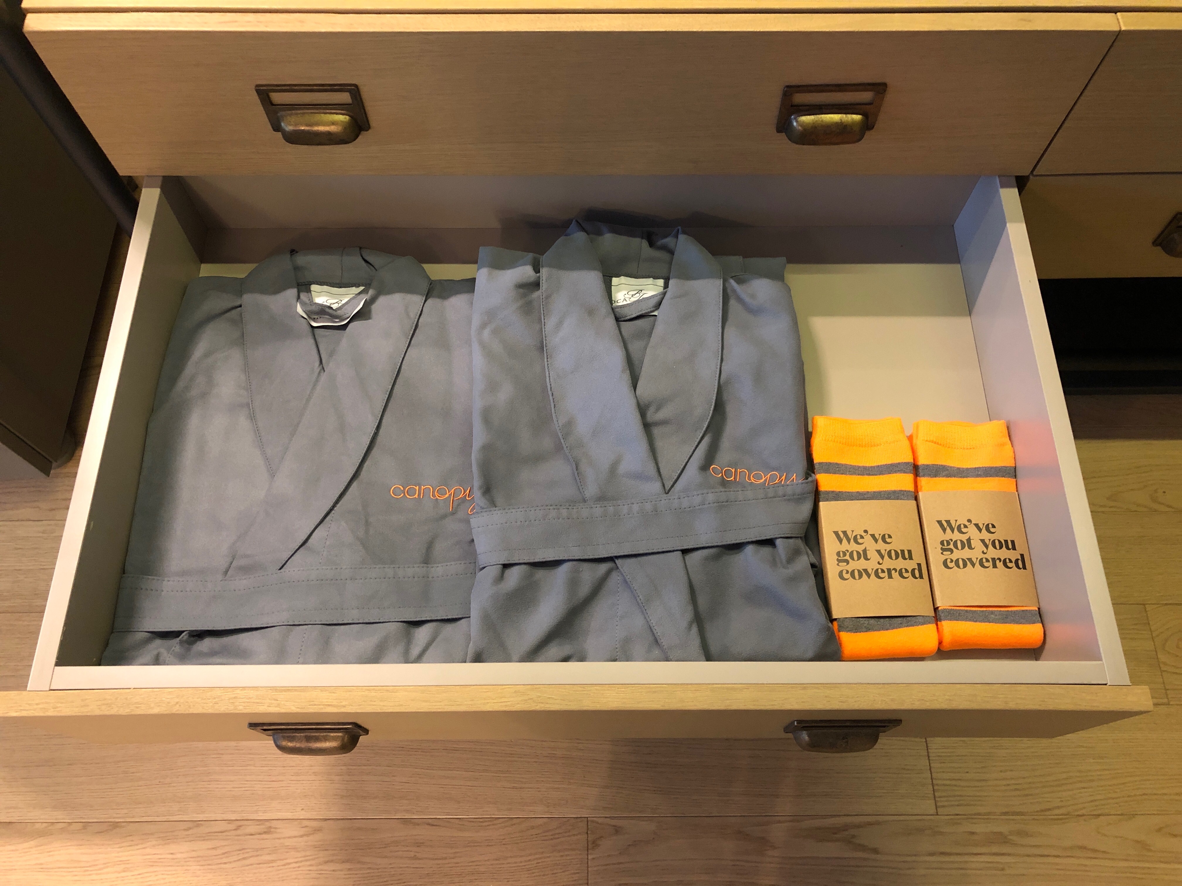 Inna ciekawostka? Zamiast zwyczajowych hotelowych kapci, Canopy oferuje wygodne, ciepłe, kolorystycznie nawiązujące do marki skarpetki. Brawo!
