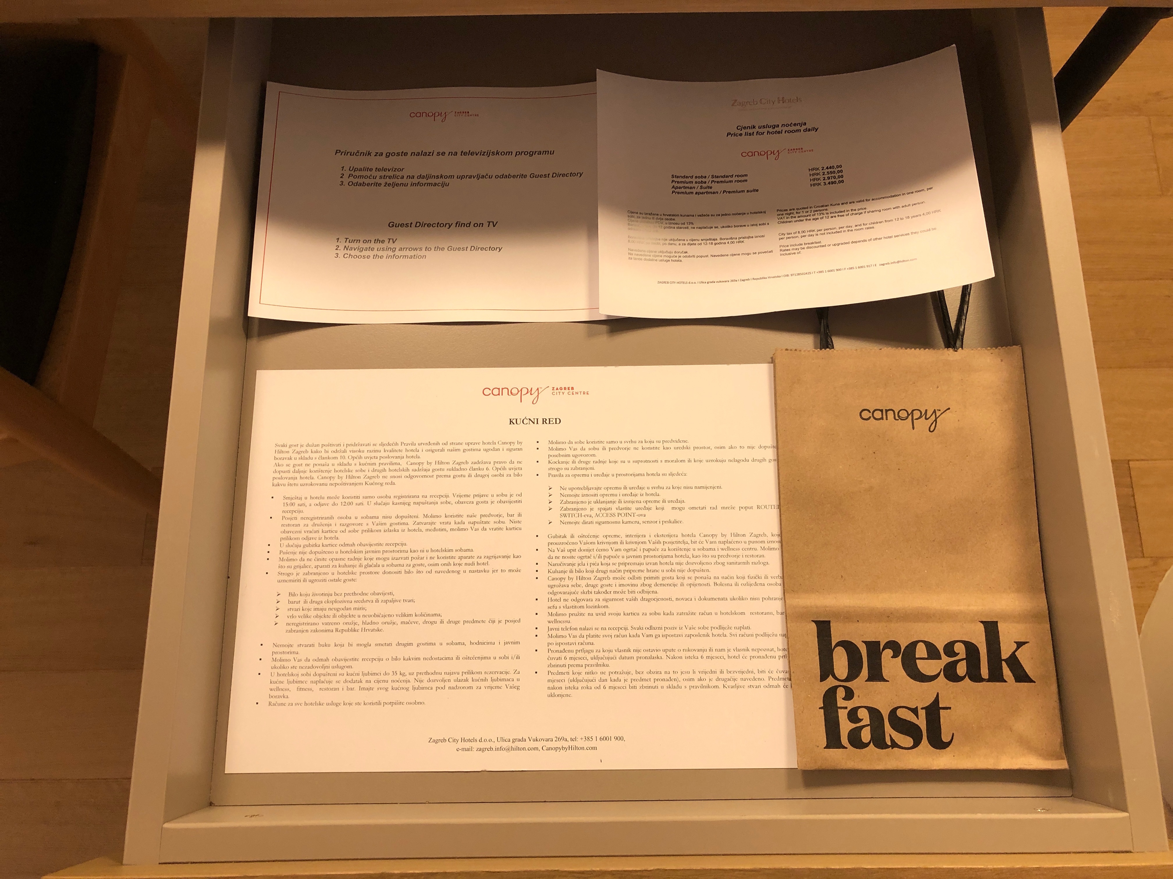 Canopy by Hilton Zagreb City Centre, Zagrzeb – apartament 507 king premium junior suite – część sypialna – informacje hotelowe, torebka do zamawiania śniadań na wynos