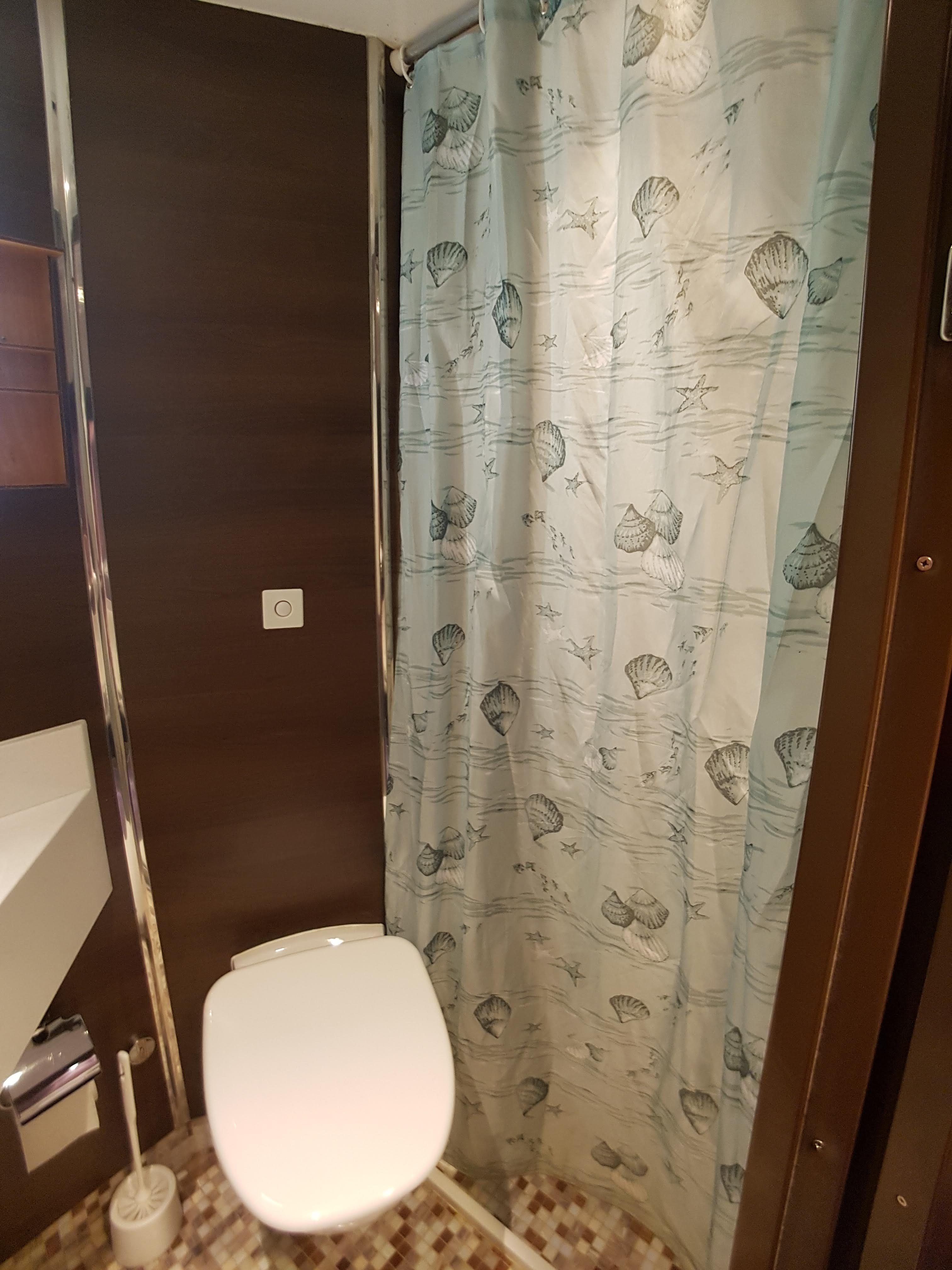 Łazienka jest największym zaskoczeniem w tej kabinie. W przeciwieństwie do kabiny klasy Comfort, znanej nam z poprzedniego rejsu, mamy tu pełnowartościową łazienkę. Całe pomieszczenie podzielone jest funkcjonalnie na trzy strefy: przedsionek z umywalką i lustrem oraz oknem, oddzielne spore pomieszczenie z prysznicem oraz dużą toaletę. W łazience dostępne są kosmetyki, kubeczki papierowe, papier toaletowy oraz ręczniki i suszarka. W przestronnym apartamencie zmieszczą się według nas spokojnie cztery osoby. To, co nam doskwierało w sąsiedniej kabinie Comfort, czyli słabo działająca wentylacja i mała ilość gniazdek elektrycznych, tutaj nie stanowiło problemu.