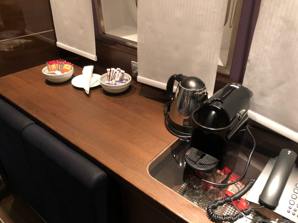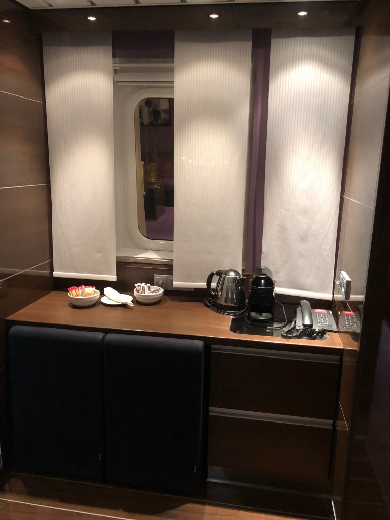 Dodatkowo w kabinie nie znalazło się miejsce na biurko z mini barem, a kosz z owocami i przekąskami (nieodpłatny) czekał na nas na stoliku. Na wyposażeniu kabiny znajdował się również ekspres do kawy oraz czajnik wraz z akcesoriami do parzenia kawy i herbaty, a także suszarka.