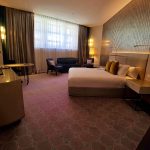 Sam pokój, oprócz swojej dużej wysokości, ma też sporą powierzchnię. Warto również zwrócić uwagę na nieregularny kształt pokoju, który jest konsekwencją kształtu historycznego budynku, w którym mieści się hotel. Gwiazdą tego pomieszczenia jest wielkie, niezwykle wygodne łóżko typu king, „przyklejone” do jednej ze ścian, którą wyłożono włoską, metaliczną tapetą. Po obu stronach łóżka tradycyjne szafki nocne, telefon, notatnik, sterowanie światłem oraz gniazda elektryczne. Nieopodal, pod umieszczonym bardzo wysoko oknem, stworzono kącik wypoczynkowy z kanapą, fotelami i stolikami kawowymi, na jednym z których umieszczono spory wybór kolorowych magazynów o różnorodnej tematyce. W pokoju znajduje się też owalne biurko, oraz komoda, na której ustawiono telewizor. Pełni ona dodatkowo rolę minibaru, a także miejsca, gdzie umieszczono całe potrzebne podczas wizyty szkło. W przedpokoju, na szafce znajduje się zestaw herbaciano-kawowy wraz z czajnikiem oraz ekspresem do kawy.