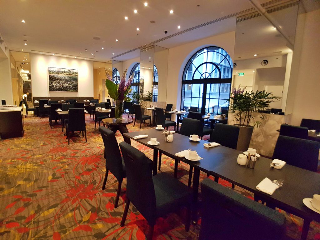 Śniadanie serwowane jest w restauracji Lady Fairfax Room znajdującej się na parterze hotelu, w dni robocze od godziny 6:30 do 10:30, w weekendy zaś od 7:00 do 11:00. Przy wejściu do restauracji pada standardowe pytanie o numer pokoju, po którym Kelnerka prowadzi nas do stolika. Po drodze, pytani o ciepłe napoje zamawiamy kawę i herbatę earl grey. Oba napoje pojawiają się na naszym stoliku zanim zdążymy wrócić z bufetu.