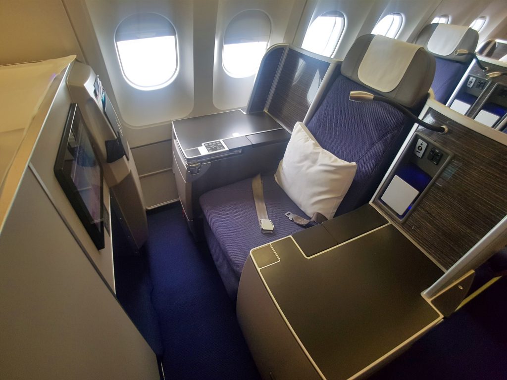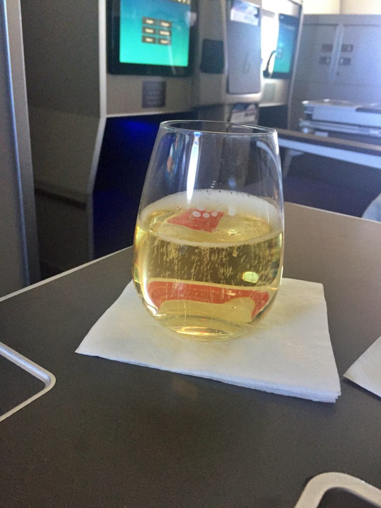 Boarding rozpoczyna się 20 minut przed czasem i tu znowu spotyka nas nieprzyjemna sytuacja. Próbujemy wejść na pokład, korzystając z elektronicznych boarding pass’ów, które przewoźnik udostępnia w swojej aplikacji. Obsługa w dość opryskliwy sposób domaga się papierowych kart pokładowych. Mija chwila, zanim wyciągamy je z bagażu podręcznego. Nasze pytania o sensowność udostępniania dokumentów w formie elektronicznej, skoro nie można ich użyć, pozostają bez odpowiedzi. Ostatecznie wchodzimy na pokład, i zajmujemy nasze miejsca, zwane tronami, o oznaczeniu 1A i 1K, przy oknach, po obu stronach samolotu. Jedno z siedzeń jest dość dziwnie wyprofilowane i buja się na boki. Zależy nam na fotelu przy oknie w pierwszym rzędzie, ze względu na zdecydowanie większą szerokość podnóżka niż w pozostałych rzędach, więc ostatecznie nie zmieniamy miejsc. Po chwili pojawia się Stewardessa z tacą pełną napojów. Do wyboru są: szampan, sok pomarańczowy, wiśniowy lub jabłkowy oraz woda. W następnej kolejności rozdawane są kosmetyczki podróżne, menu oraz słuchawki.