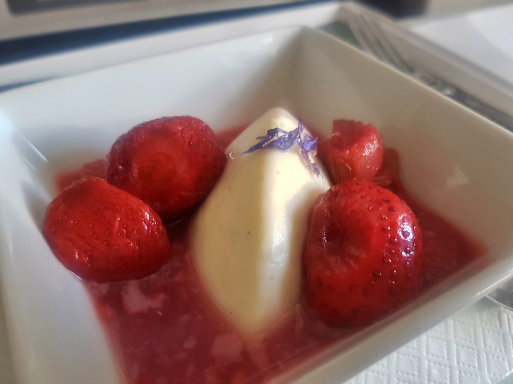 Brussels Airlines – Klasa Biznes w Airbus A330 Bruksela – Mumbaj – deser – rabarbar i truskawki z serkiem mascarpone