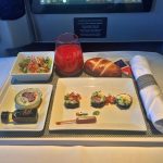 Po amouse-buche czas na główny serwis. Stewardessy rozkładają obrusy na stolikach i po chwili serwują przystawki. Tym razem otrzymujemy metalowe sztućce. W tej chwili zauważamy, że w przeciwieństwie do wielu linii, w Brussels Airlines załoga nie zbierała od pasażerów zamówień na dania przed rozpoczęciem serwisu.