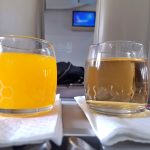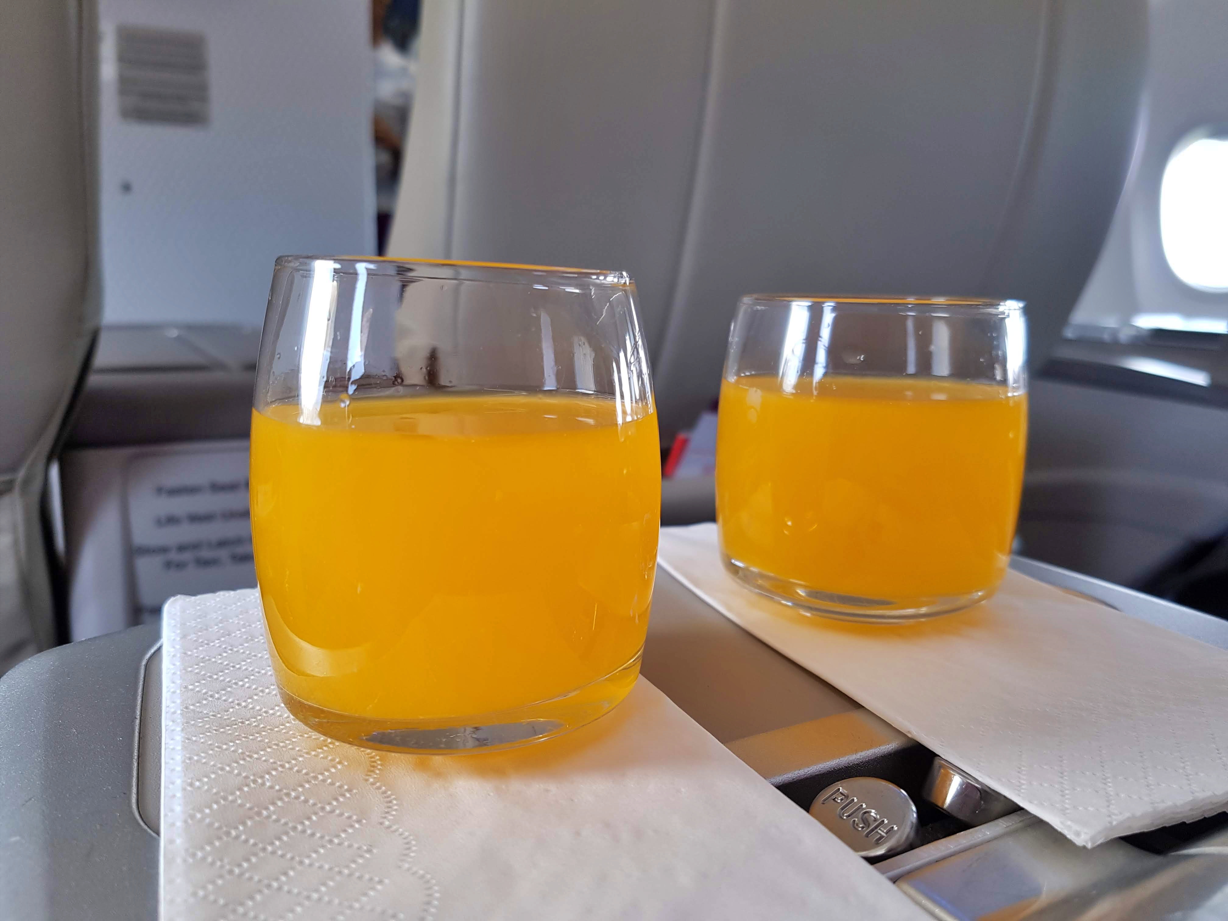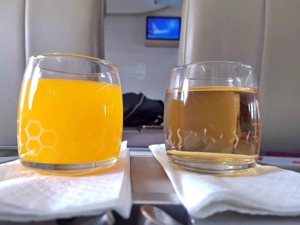 Konfiguracja foteli jest identyczna jak w przypadku poprzedniego lotu, więc bez zbędnej zwłoki zajmujemy miejsca i rozsiadamy się wygodnie. Po chwili pojawiają się welcome drinki. Możemy wybrać wodę, sok pomarańczowy lub sok jabłkowy. Dodatkowo Stewardessa przedstawia nam dzisiejsze menu (nie ma wersji drukowanej) i pyta o nasz wybór.