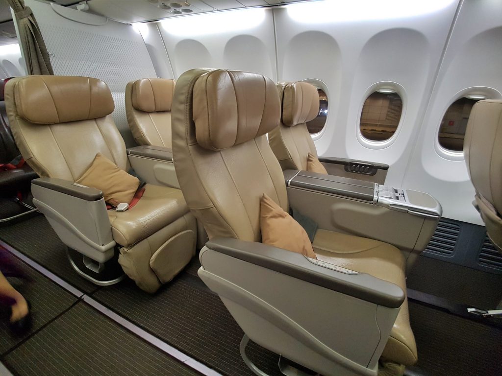 Przyglądamy się fotelom. W przeciwieństwie do europejskiej klasy biznes, znanej na przykład z pokładów Lufthansa, Alitalia czy Aegean Airlines, linie lotnicze w Azji oferują szerokie, wygodne fotele, z dość dużym kątem odchylenia, ustawione w konfiguracji 2-2. Skórzane siedzenia, w odcieniach beżu i brązu z dodatkami w tych samych kolorach, wyposażone są w regulowane zagłówki oraz podnóżki, a panel mechanicznego sterowania funkcjami fotela znajduje się z jego boku, zupełnie jak w klasie biznes na pokładach Airbus 320 linii Air China. Fotele nie rozkładają się do pozycji leżącej (lie-flat), ale stopień odchylenia jest na tyle duży, że można się w nich wygodnie zdrzemnąć. W środkowej części konsoli znajdują się gniazda elektryczne.