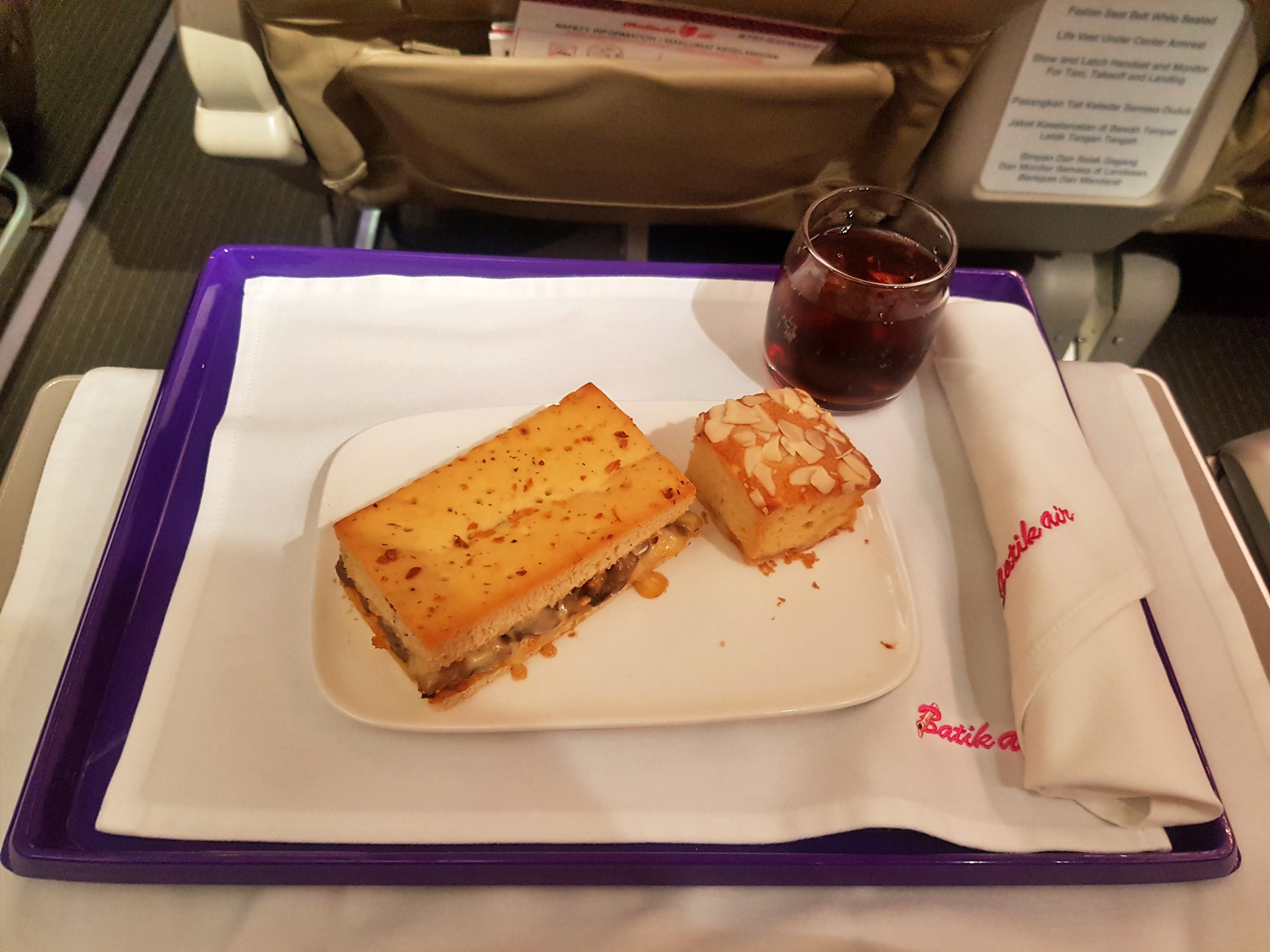 Kwadrans po starcie załoga rozpoczyna serwis. Na początku rozkładamy stolik, a Stewardessa nakrywa go obrusem, który nosi logo Batik Air. Napoje oraz wybrane danie wraz z ciastkiem podawane są na jednej tacy. Jako pierwszy jedzenie otrzymuje UM, który został przesadzony przez Szefową Pokładu do ostatniego rzędu w klasie biznes. Młody pasażer jest zachwycony serwisem i pizzą, którą otrzymał. Dodatkowym plusem jest fakt, że ma teraz miejsce przy oknie i może podziwiać widoki. Otrzymujemy nasze tace oraz dodatkowo herbaty.