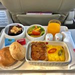 Podczas wejścia na pokład ponownie sprawdzane są nasze karty pokładowe. Znamy już dobrze konfigurację siedzeń z poprzednich lotów, więc siadamy wygodnie w swoich fotelach i wybieramy napoje powitalne (do wyboru bez zmian: woda, sok pomarańczowy i jabłkowy) oraz słuchamy uważnie prezentowanego przez Stewardessę menu. Na locie międzynarodowym do Kuala Lumpur serwowane są: krewetkowe biryani, kurczak w czarnym pieprzu, kurczak w chili z ryżem oraz danie wegetariańskie z ryżem. Wybieramy krewetkowe biryani oraz kurczaka w chili.