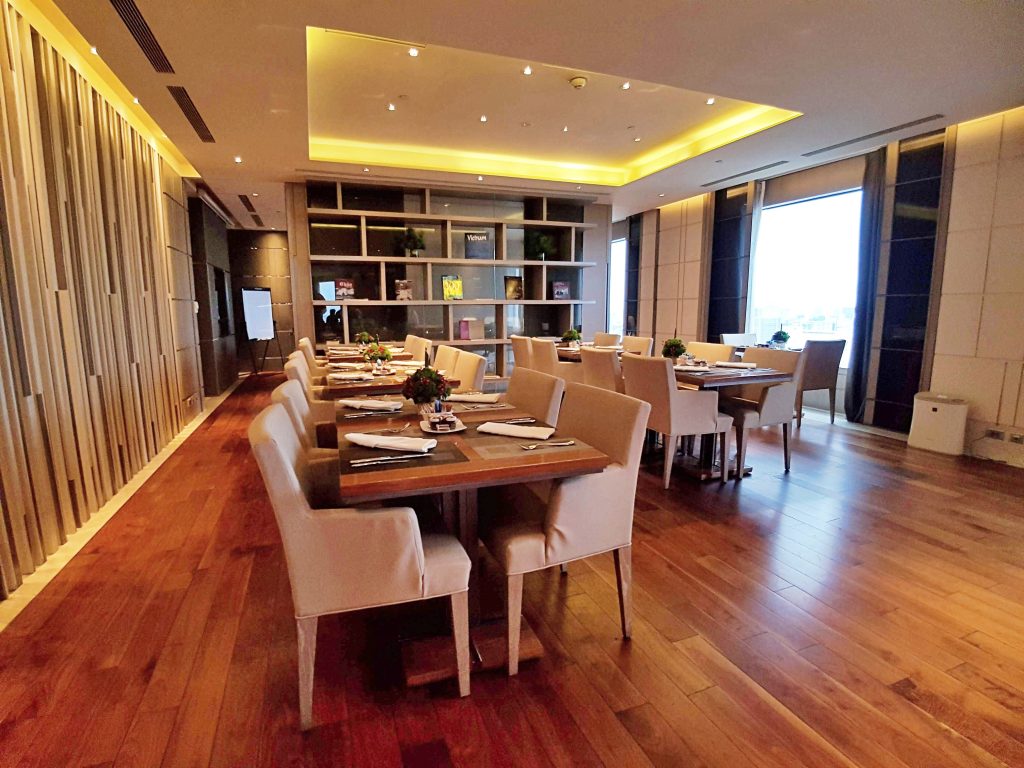 Na dwudzieste trzecie piętro jedzie z nami asystentka, która przejęła nasze bagaże. Odprowadza nas do stanowiska recepcyjnego saloniku, gdzie przekazuje sprawę koleżance. Na miejscu wszystko przebiega sprawnie – obsługa odbywa się na siedząco. Zanim zdążymy wygodnie usiąść w fotelach, przed nami lądują drinki powitalne, oraz wilgotne ręczniczki do odświeżenia. Po przejściu niezbędnych formalności, obsługująca nas pracownica lounge proponuje nam skorzystanie z oferty saloniku, w czasie, kiedy Ona dokończy wszystkie potrzebne formalności meldunkowe. Mamy więc chwilę, aby się rozejrzeć. Jest tu sporo miejsc siedzących, spory, odkryty taras z piękną panoramą na miasto, oraz niemal niezauważalna, ale zawsze bliska gościa obsługa. Do dyspozycji gości jest też bufet, w którym cały dzień serwowane są słodkie ciasta, małe kanapki w maślanych bułkach, słodkie i słone przekąski, owoce, a także cała gama napojów – od soków i wody, przez napoje gazowane, aż po serwowane przez obsługę kelnerską napoje ciepłe.