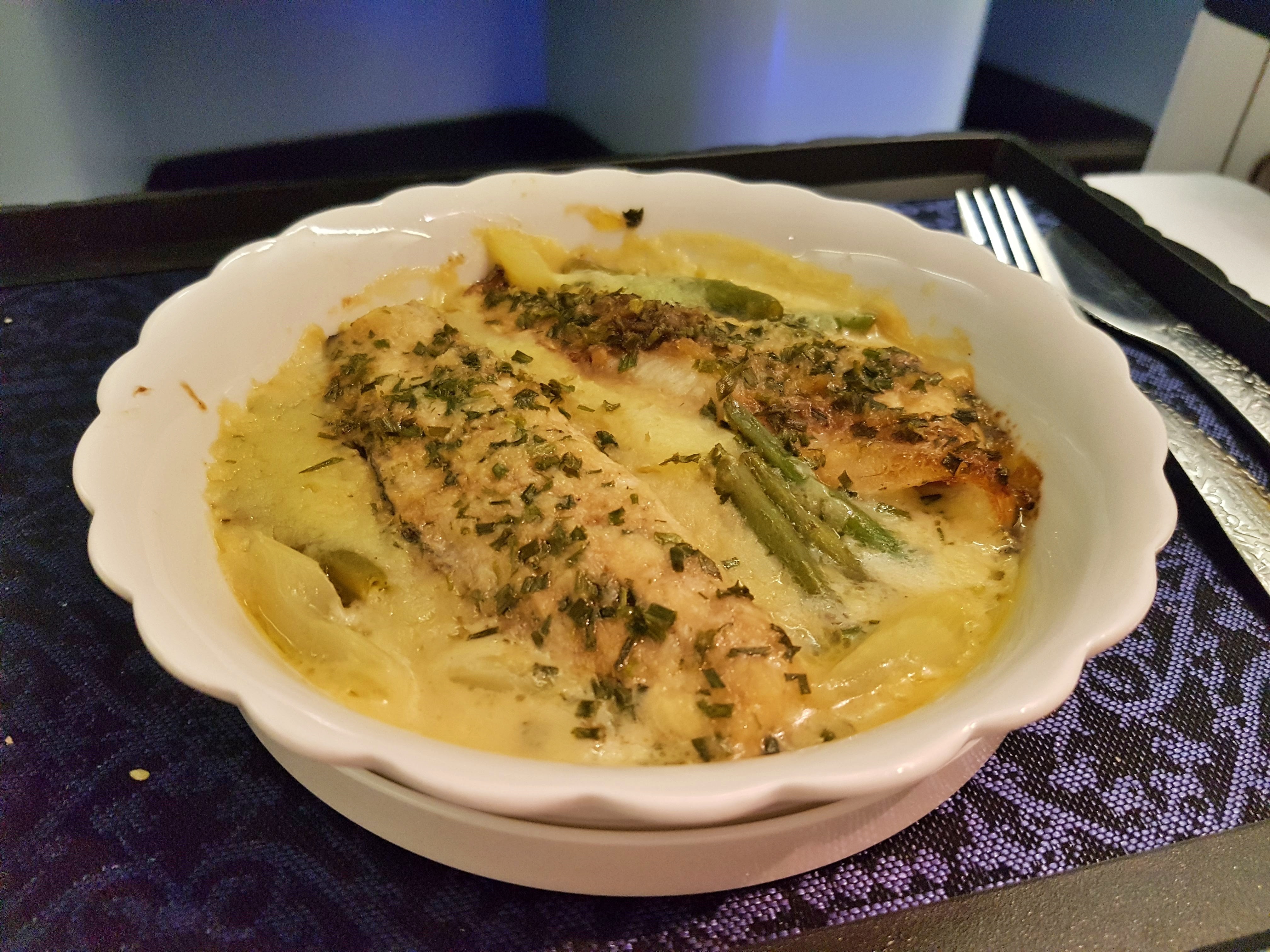 Na stolikach lądują obrusiki, a po nich z wózka serwowana jest kolacja. Podawana na tacy przystawka, w naszym przypadku to wołowina oraz zupa. Obie propozycje są smaczne i jak najbardziej adekwatne, ale częścią uwertury do właściwej kolacji, która skradła nasze serce jest sałatka. Jest to rzecz warta odnotowania szczególnie, że zazwyczaj sałatki są najsłabszymi częściami lotniczych posiłków, znajdującymi swoje miejsce w zestawie bardziej z obowiązku, niż jako ważny element ferii smaków. Tu jest inaczej. Świeże liście różnych gatunków sałat, kawałki buraka, mierzwiony, twardy ser w typie Old Amsterdamer, a do tego kompletna petarda, czyli vinegrette buraczany. Taką sałatkę moglibyśmy jeść na każdym locie, przy każdym posiłku. Wartym odnotowania jest fakt, że podawane z koszyczka pieczywo jest świeże, ciepłe, nie przemoczone i gumowate, jak to się w samolotach często zdarza. Duży szacunek za dbałość o szczegóły.