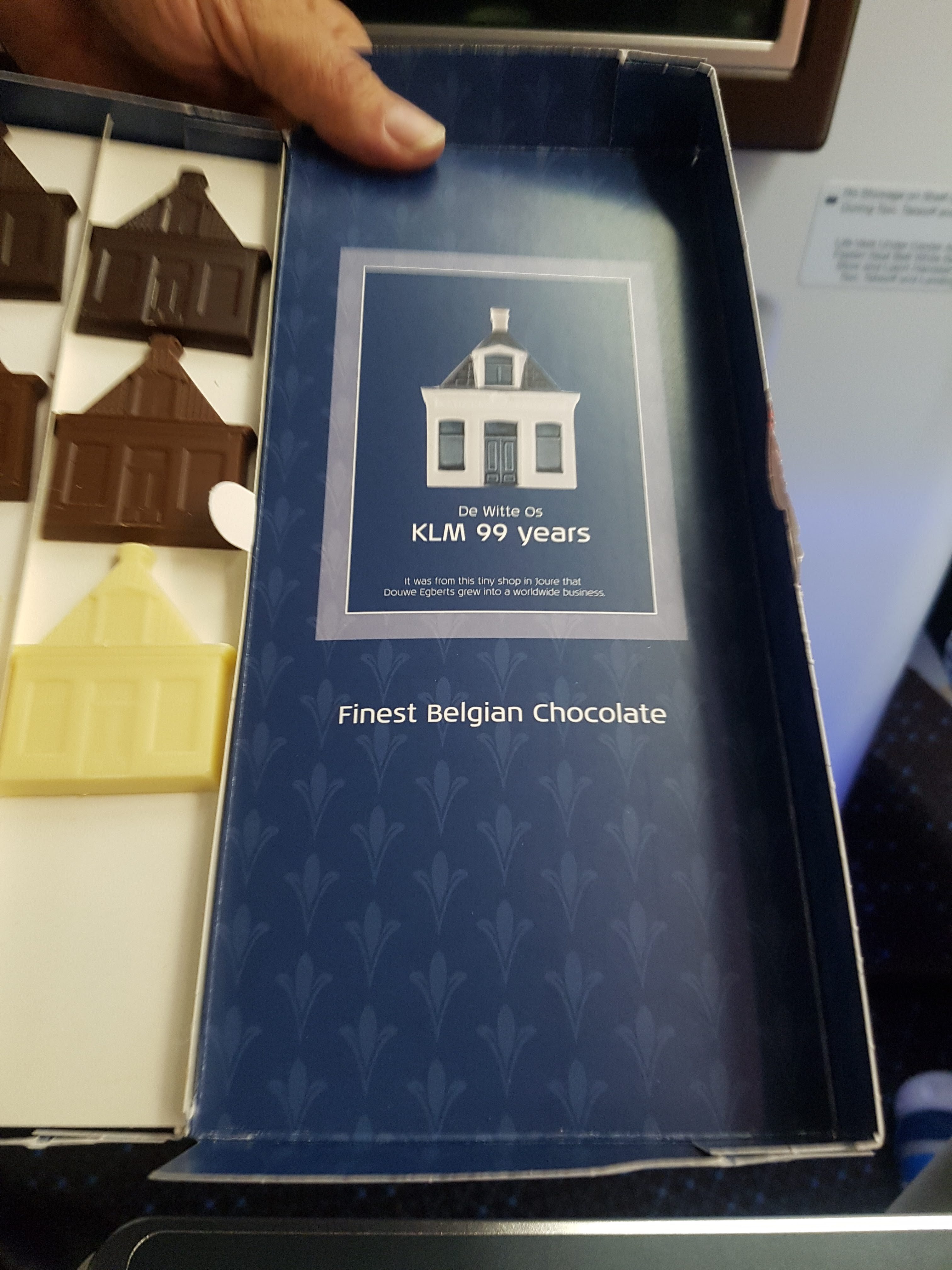 Tak nam się przynajmniej wydawało. Przy podawaniu ciepłych napojów, które zamówiliśmy po posiłku, Purser częstował jeszcze pasażerów pięknymi czekoladkami w kształcie słynnych, holenderskich domków, będących jednym z symboli linii.