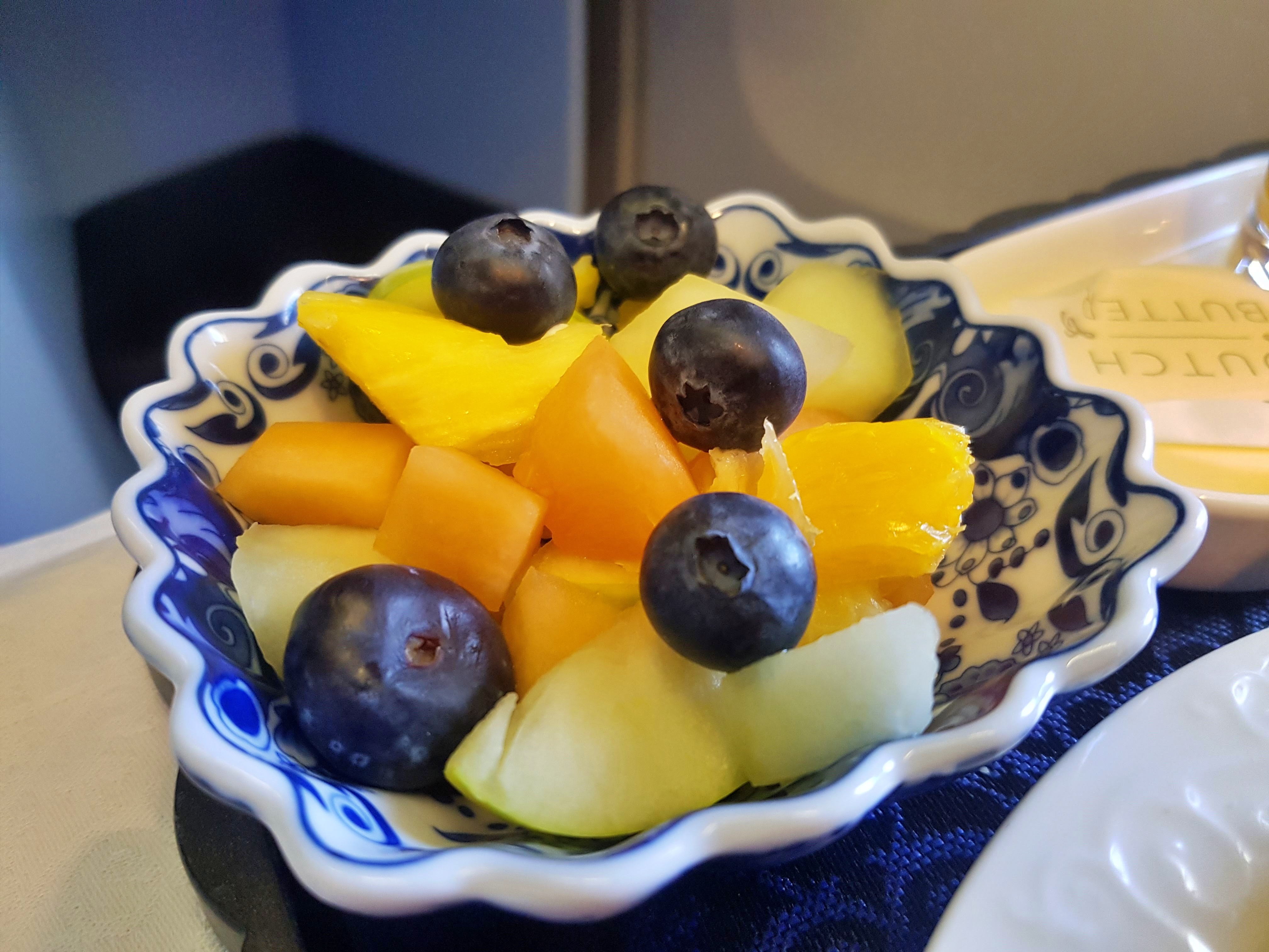 Spróbowaliśmy śniadania na słodko, którego głównym elementem było rodzaj ciasta, przypominający crumble, z dużą zawartością jabłek. Było ono bardzo smaczne, choć miejscami nieco zbyt suche. Inne elementy tego posiłku to wybór owoców, pieczyw, podawane z koszyka – smaczne, gorące i chrupiące, pyszne masło i konsystencji umożliwiającej smarowanie w momencie podania, ser, oraz pyszny, schłodzony, świeżo wyciskany sok pomarańczowy. Napoje gorące podawane były wedle zamówienia. Całość „śniadania” była smaczna i jak najbardziej adekwatna do pory przylotu i długości lotu.
