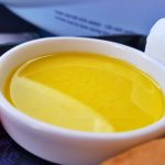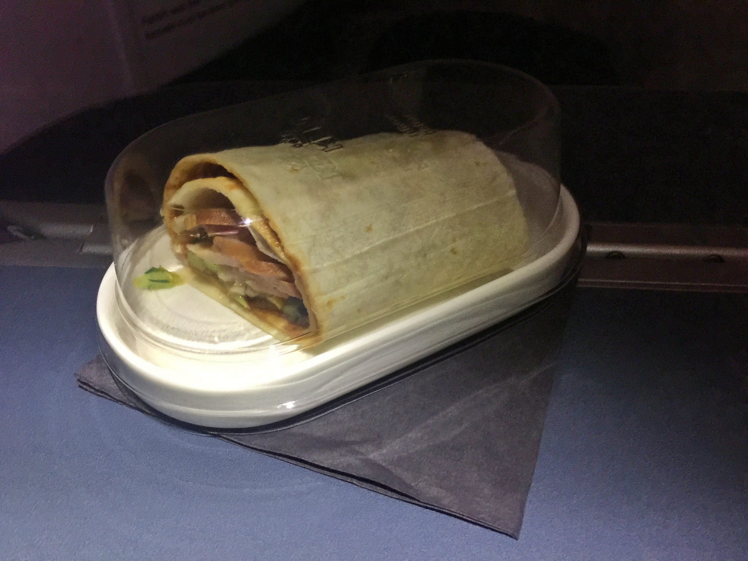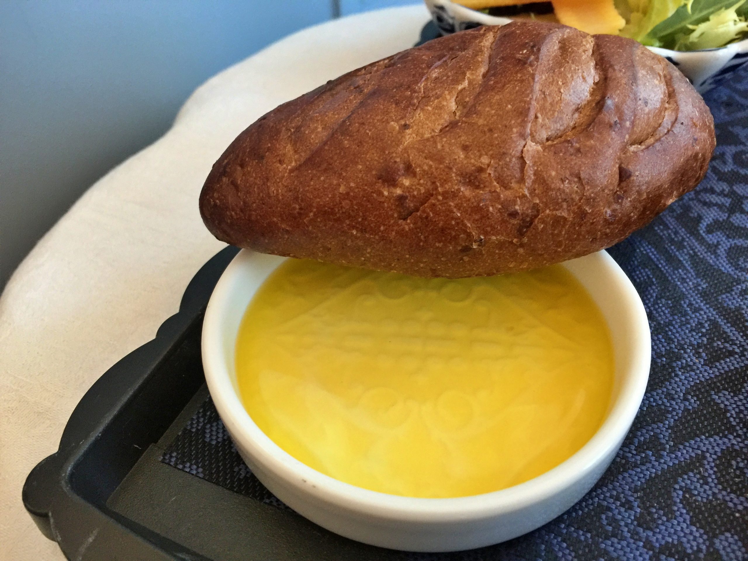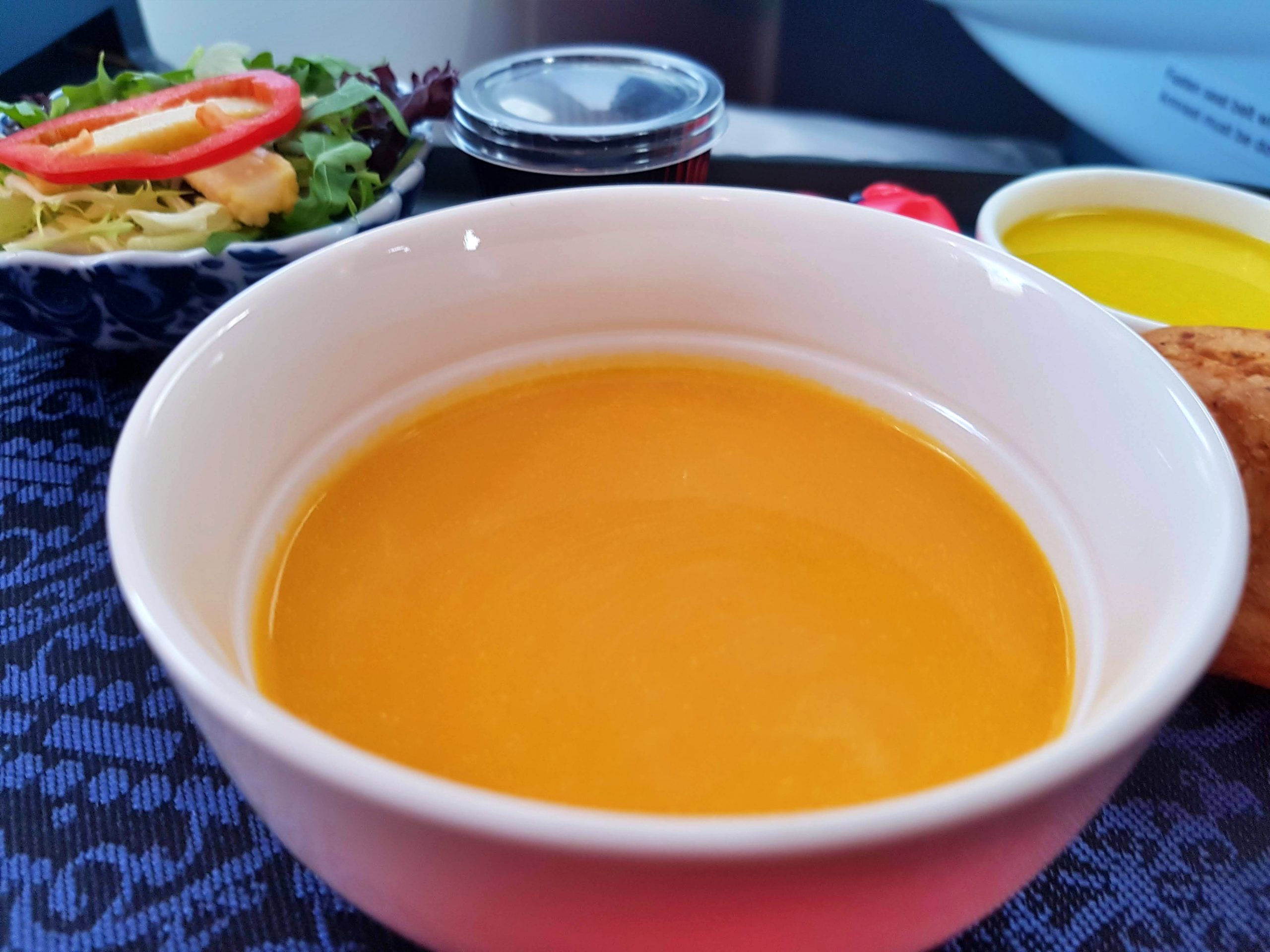 Godzinę po starcie rozpoczyna się serwis obiadowy. Stewardessy korzystają z wózka cateringowego, podając każdemu pasażerowi tacę z jego posiłkiem oraz napoje. Dodatkowo serwują ciepłe pieczywo, które jak się później okazuje, jest rewelacyjne – mięciutkie, wcale nie gumowe, w smaku lekko maślane. Jako przystawkę zaserwowano tatar z wędzonego łososia z serkiem śmietanowym oraz zupę dyniowo-imbirową, która jest nalewana z termosu wprost do miseczki przy fotelu pasażera. Tatar był mało doprawiony, zupełnie płaski w smaku, za to zupa była rewelacyjna – gorąca, gęsta i kremowa, pełna smaku. Imbir ciekawie podkręcał walory smakowe dyni. Standardowo, nie liczymy zbytnio na sałatkę. Jest to słuszna koncepcja, gdyż jest ona nijaka. Zwiędnięte liście sałaty, smutne kawałki papryki i kukurydzy konserwowej sprawiają, że nawet po potraktowaniu jej dressingiem jest co najwyżej średnio.