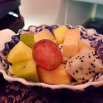 Czas pomiędzy uprzątnięciem zastawy po przystawkach, a podaniem głównego dania to prawie pół godziny. W naszej opinii to zbyt długo, i sądząc po reakcjach pozostałych pasażerów w kabinie, im również przeszkadzało tak długie oczekiwanie. W końcu otrzymujemy dania główne. Wybraliśmy gulasz wołowy w sosie grzybowym z groszkiem śnieżnym, karotką, cukinią i purée ziemniaczano-dyniowym oraz danie chińskie – duszoną wieprzowinę w pikantnym sosie, smażone krewetki z warzywami, duszone warzywa oraz rzecz jasna ryż. Danie chińskie smaczne i treściwe. Z kolei gulasz, może nie prezentuje się na zdjęciach atrakcyjnie, ale musicie nam uwierzyć na słowo, że w smaku był fantastyczny. Mięciutkie mięso w aromatycznym, grzybowym sosie i do tego jedyne w swoim rodzaju purée z dyni i ziemniaków. Tym, co nam nie pasowało w tym daniu były rozgotowane warzywa.