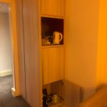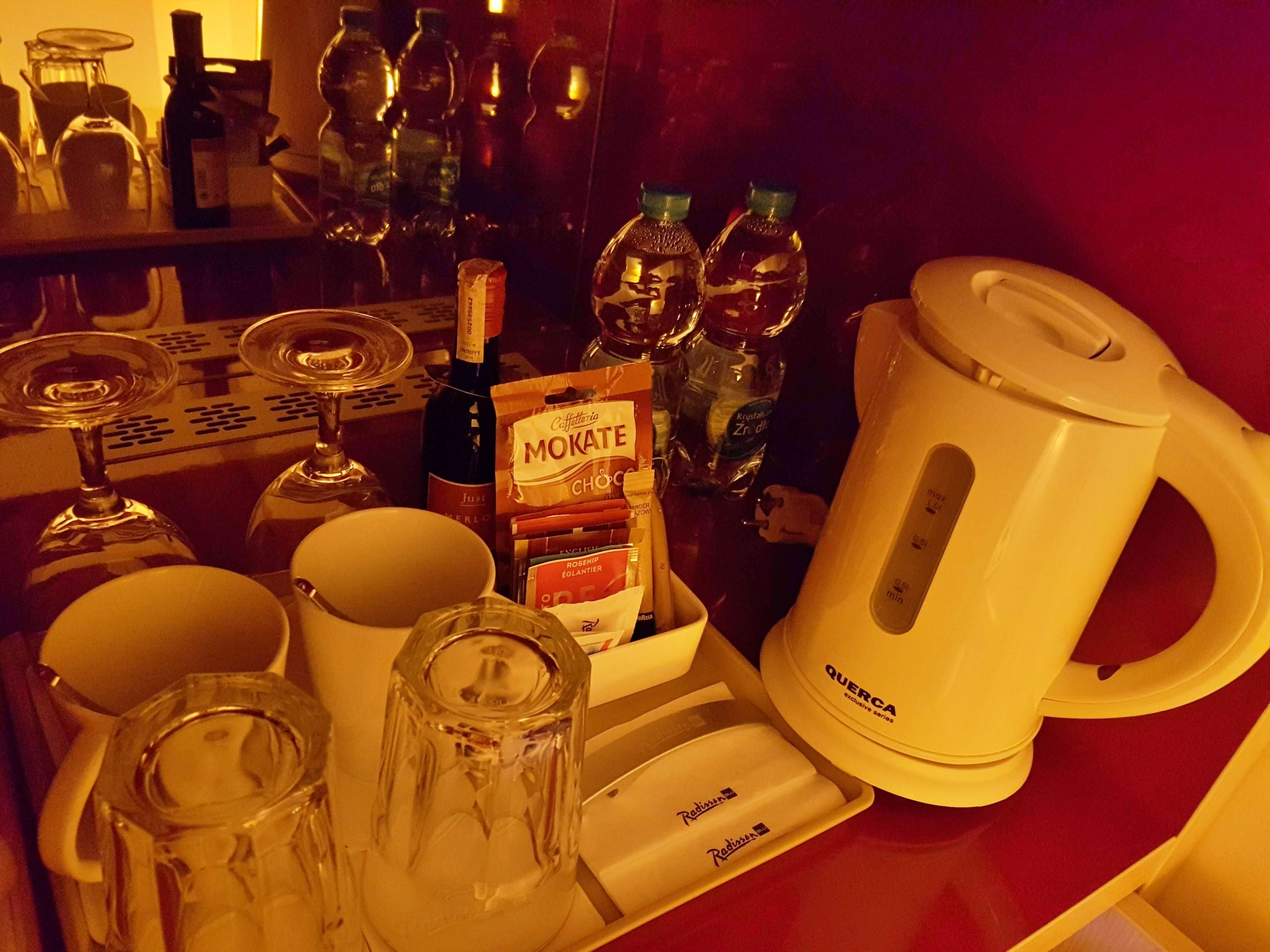 Według pracowników hotelu jest to pokój po renowacji. Jeśli tak, to miała ona miejsce dawno temu – dokładnie taki sam pokój odwiedziliśmy w Radisson Blu Szczecin na pewno już niemal 6 lat temu – w każdym razie z tego już czasu mamy w swoim archiwum zdjęcia identycznie wyposażonego pokoju. Trzeba sobie powiedzieć jasno – jeśli rzeczywiście jest to pokój odnowiony, to jego aranżacja nie wytrzymuje nawet tak krótkiej próby czasu. Na zastawionym w większości materiałami promocyjnymi biurku, poza nimi niewiele się mieści. Zniknęły też jedne z nielicznych jasnych punktów pokoju znanych z poprzedniej wizyty – świeże kwiaty. Została za to za mała półka na zestaw do parzenia kawy i herbaty, z przechylonym ze względu na niewystarczającą ilość miejsca bądź zły dobór wymiarów tacy czajnikiem. Jest też schowany na najniższej półce tej samej szafy ekspres do kawy – jak zwykle bezużyteczny, bo nie ma go nawet gdzie rozstawić, aby zaparzyć kawę, bez przemeblowania połowy pokoju. Z drugiej jednak strony, doceniamy działania oszczędnościowe zarządców hotelu – zużycie kawy i eksploatacja ekspresów, zlokalizowanych w tak wymyślnym miejscu, muszą być minimalne. Brawo!