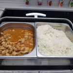 Najważniejszym dla wielu osób będzie zapewne opis części lounge, pełniącej funkcję baru i bufetu. Zacznijmy więc od bufetu. W czasie naszej wizyty, nie był on nadmiernie rozbudowany. Na ciepło serwowano gulasz drobiowy z ryżem. Goście mogli też posilić się gotowymi sałatkami, podawanymi w salaterkach, z dodatkiem kilku sosów do wyboru. Było też pieczywo, płatki śniadaniowe, wędliny, ser, a także słodkie wypieki.