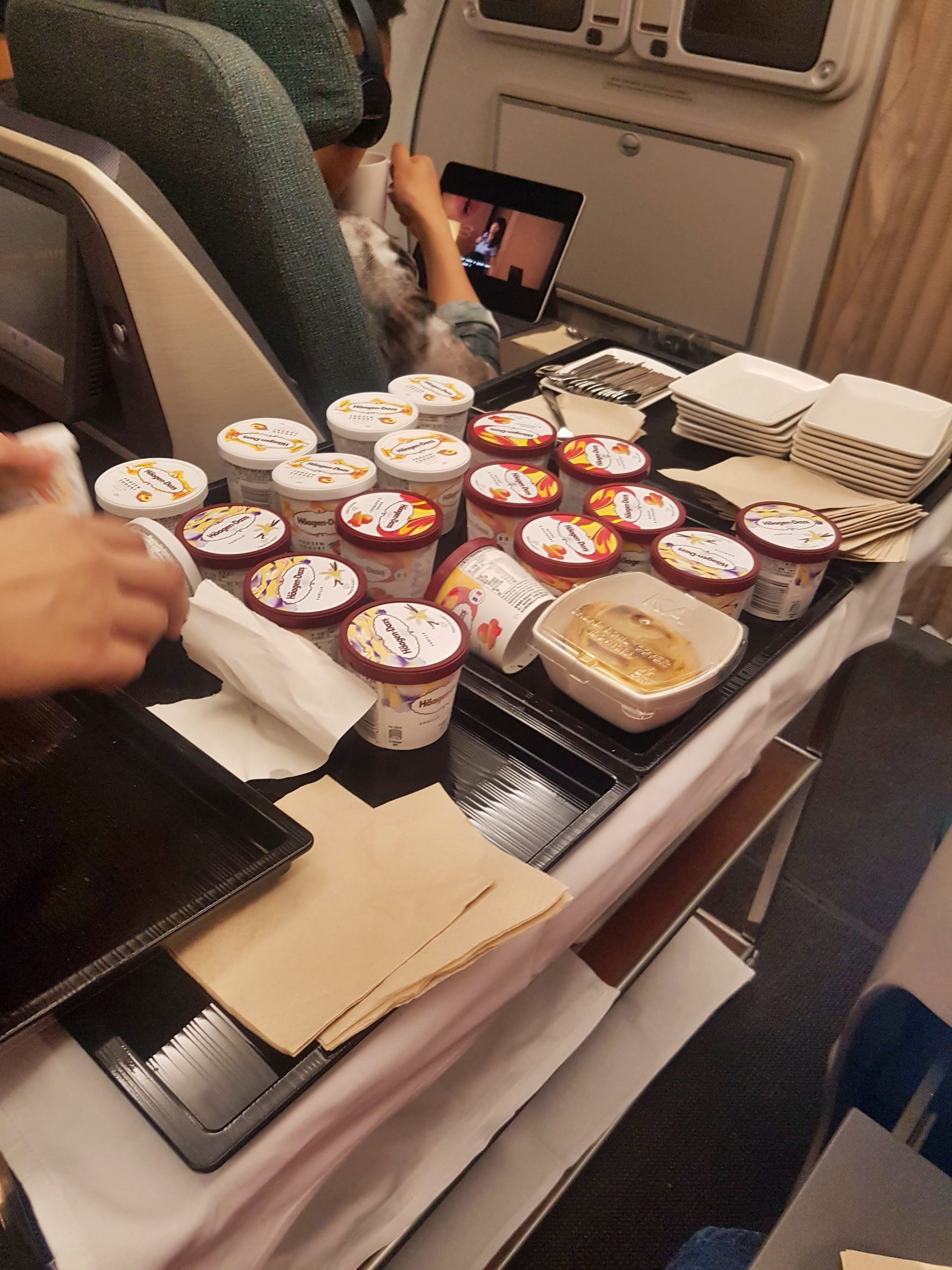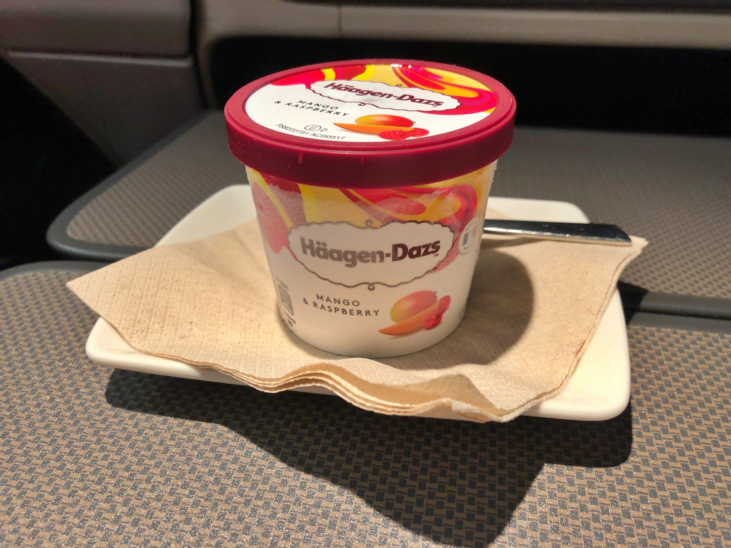 Po ekspresowym serwisie nastąpiło jeszcze szybsze zebranie tacek i serwowanie deseru z wózka. Naturalnie zostaliśmy poczęstowani lodami Haagen-Dazs. Tym razem były podane w dobrej temperaturze i mogliśmy je od razu zjeść.