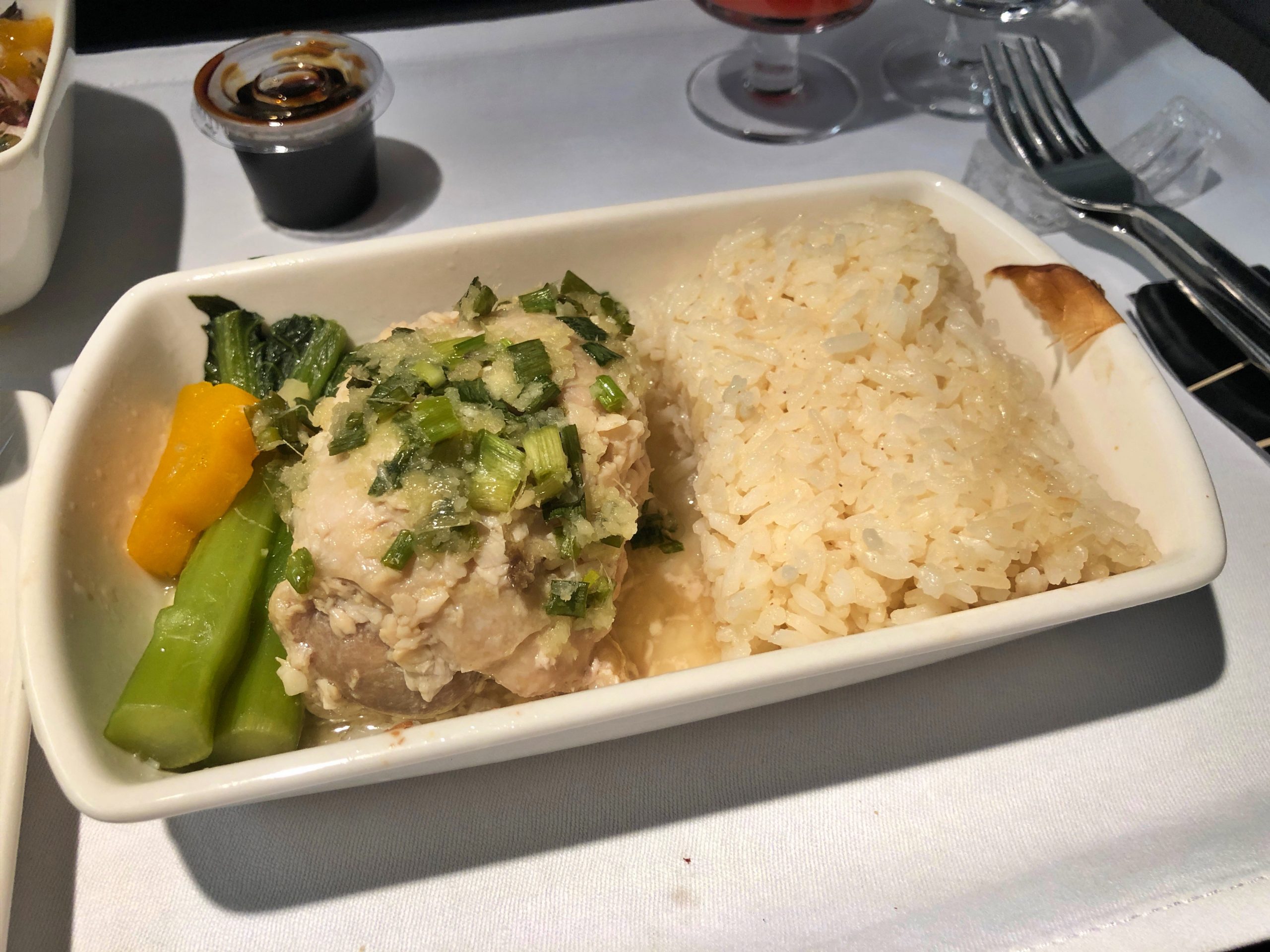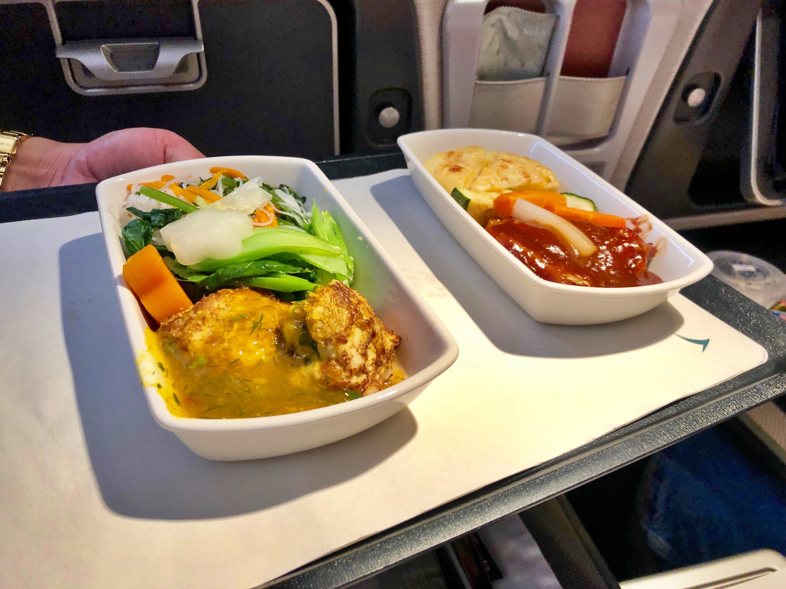 W przeciwieństwie do lotu z Hanoi, tym razem potrawy nas nie zachwyciły. Jako przystawkę podano pasztet, lekko słodkawy, ale generalnie mało wyraźny w smaku wraz z sałatą – miękką i niechrupiącą. Jako danie główne wybraliśmy smacznego, wilgotnego kurczaka w sosie teriyaki po hainańsku z perfekcyjnie klejącym ryżem oraz mięsistą rybę solę z poprawnym ragout warzywnym. Dania były smaczne, ale bez większych zachwytów.