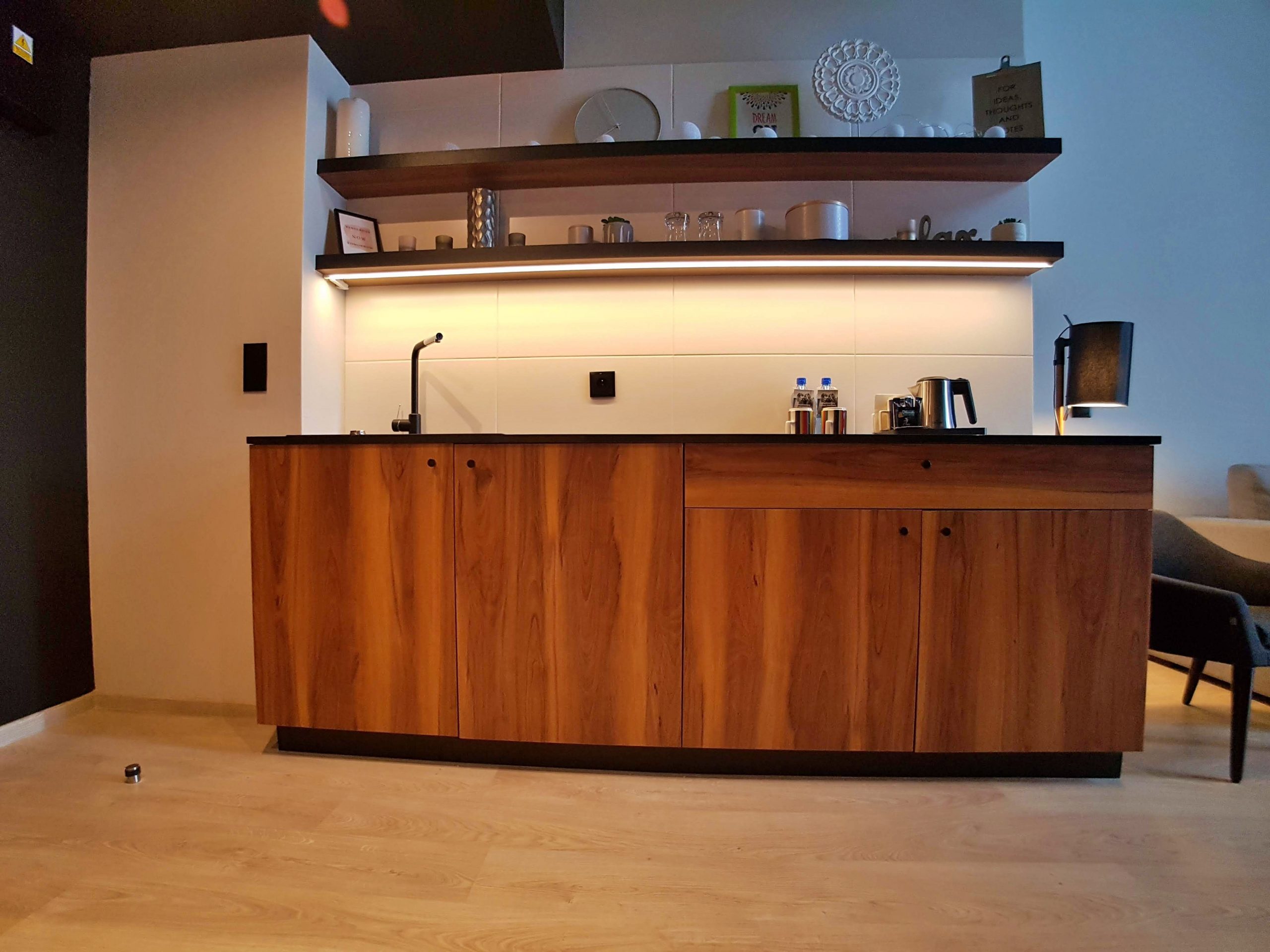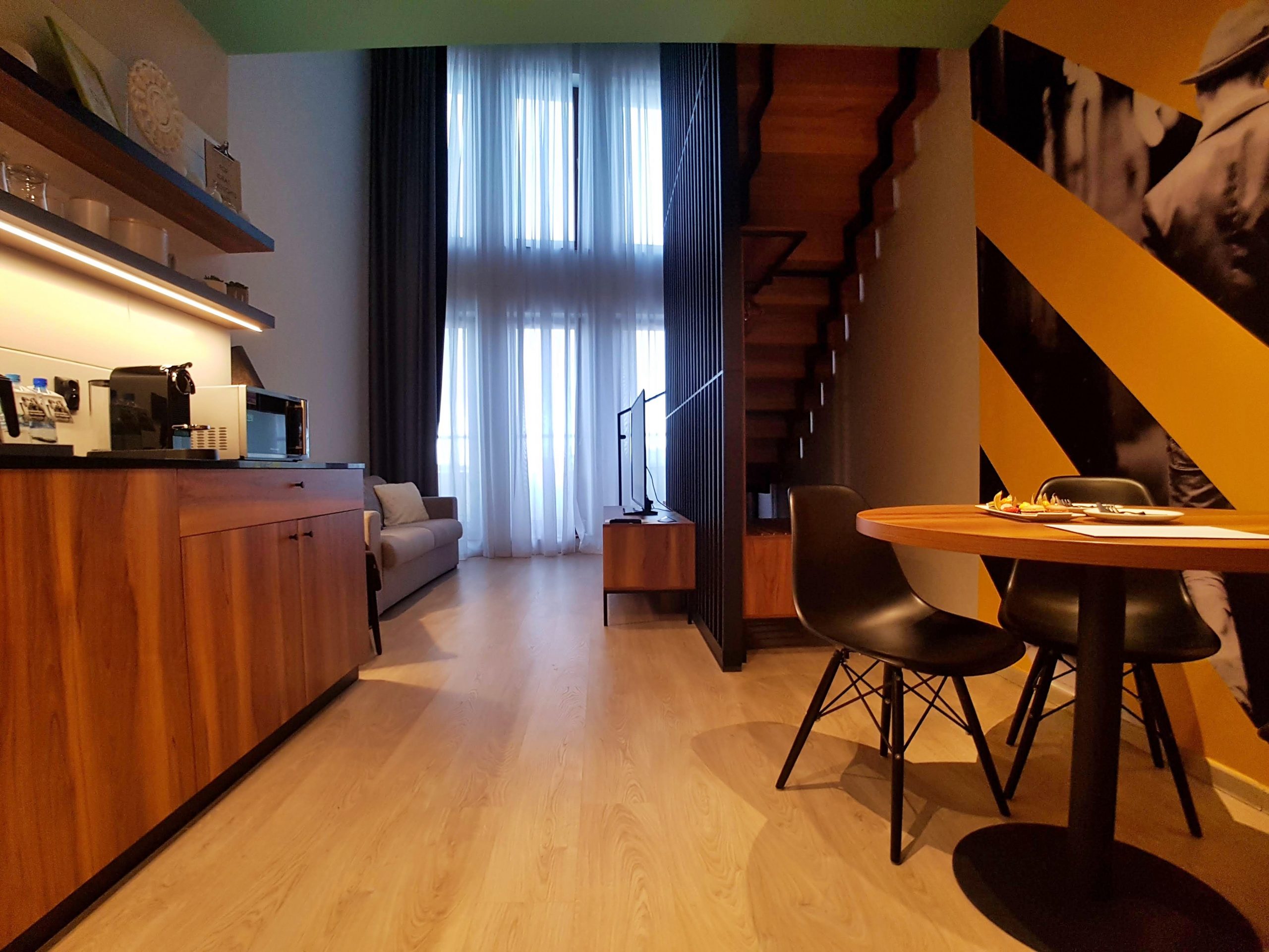 Na dole, czyli tam, gdzie wejście, do dyspozycji Gości oddano małą kuchnię (która przy naszej pierwszej wizycie nie była jeszcze w pełni wyposażona), z lodówką, czajnikiem, kapsułkowym ekspresem do kawy oraz kuchenką mikrofalową, a także wygodnym zlewem. Jest tu też stół z czterema krzesłami, a w głębi pokoju fotel i kanapa, oraz szafka z wielkim telewizorem. Pomieszczenie jest jasne, bo ściana na przeciw wejścia składa się z trzech kompletów drzwi na balkon, oraz trzech wysokich okien. Na przeciw kanapy znajdują się, prowadzące do sypialni schody. Sprytnie i funkcjonalnie zaaranżowano przestrzeń pod schodami – postawiono tam wieszak z półkami, podobny do tego w innych pokojach, co tworzy z tego miejsca namiastkę garderoby.