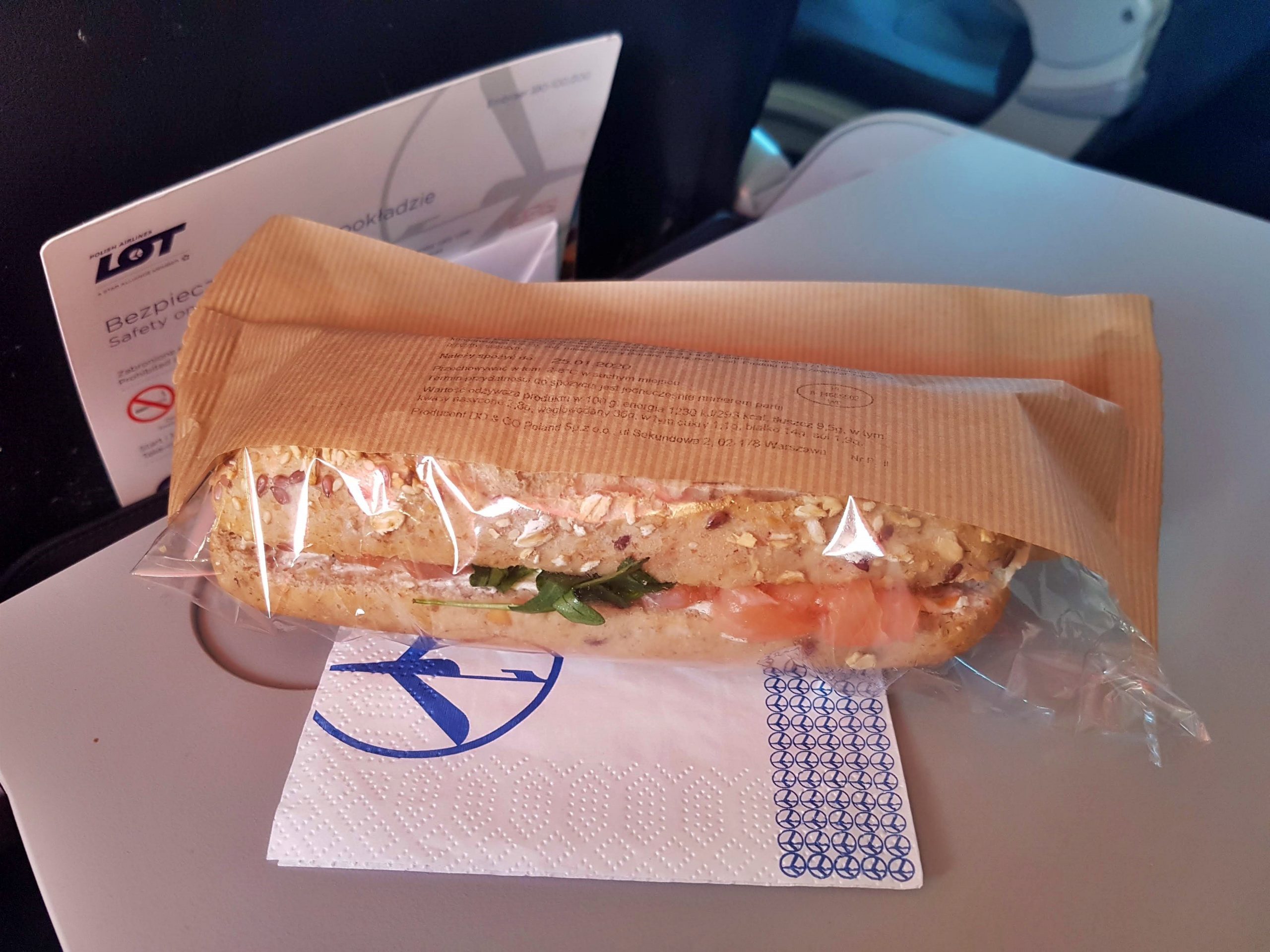Kanapka ze schabem, ogórkiem konserwowym i sosem musztardowo – miodowym w pełnoziarnistej bułce – duża ilość wędliny i dodatków sprawia, że kanapka nie jest sucha. Do tego pyszne, świeże pieczywo z ziarnami. Według nas jest to najlepsza kanapka, jaką jedliśmy na pokładzie samolotu. Cena – 15 PLN