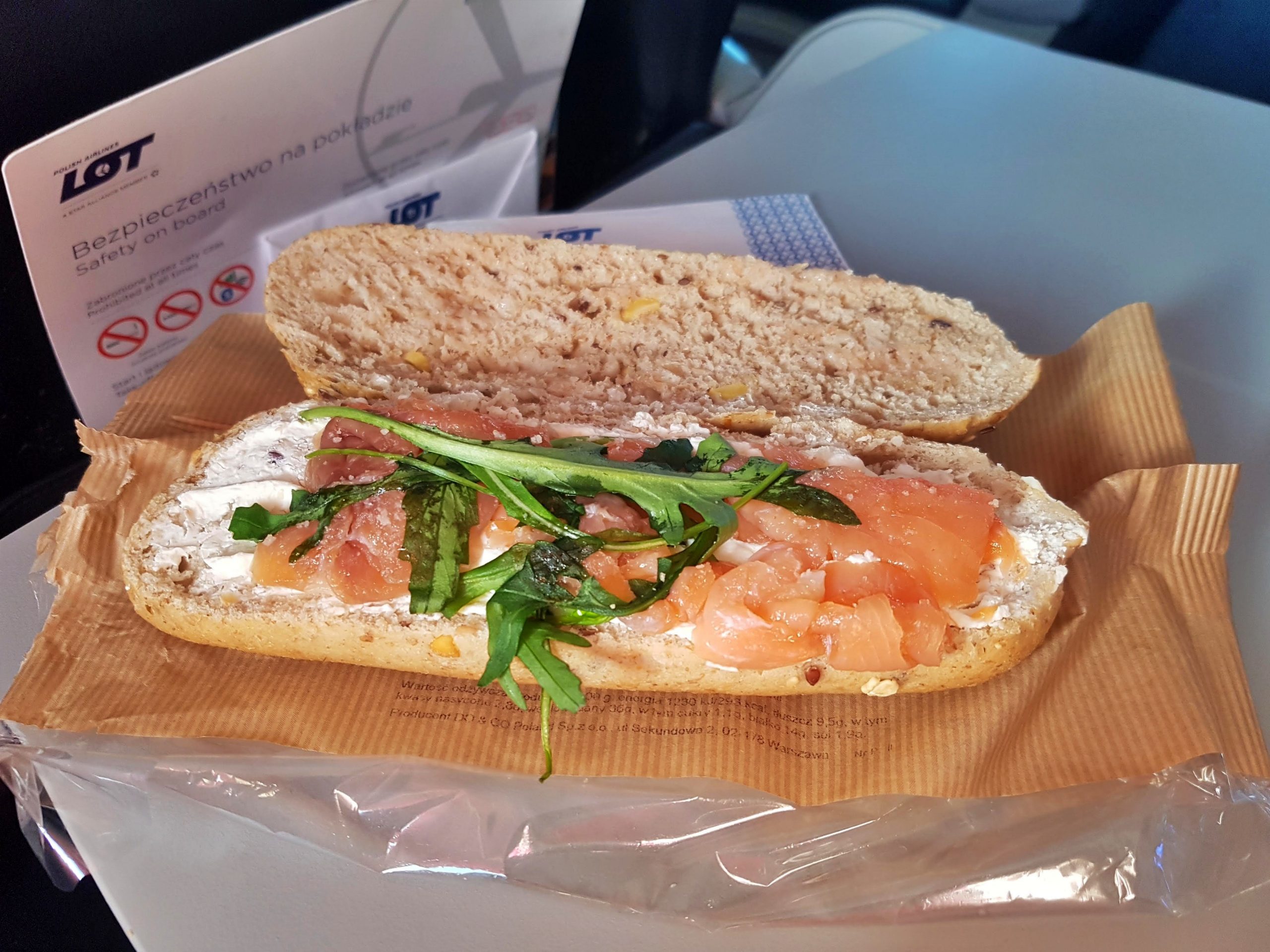 LOT Gourmet – Sky Bar – kanapka z wędzonym łososiem, serkiem chrzanowym, rukolą i kaparami w pełnoziarnistej bułce
