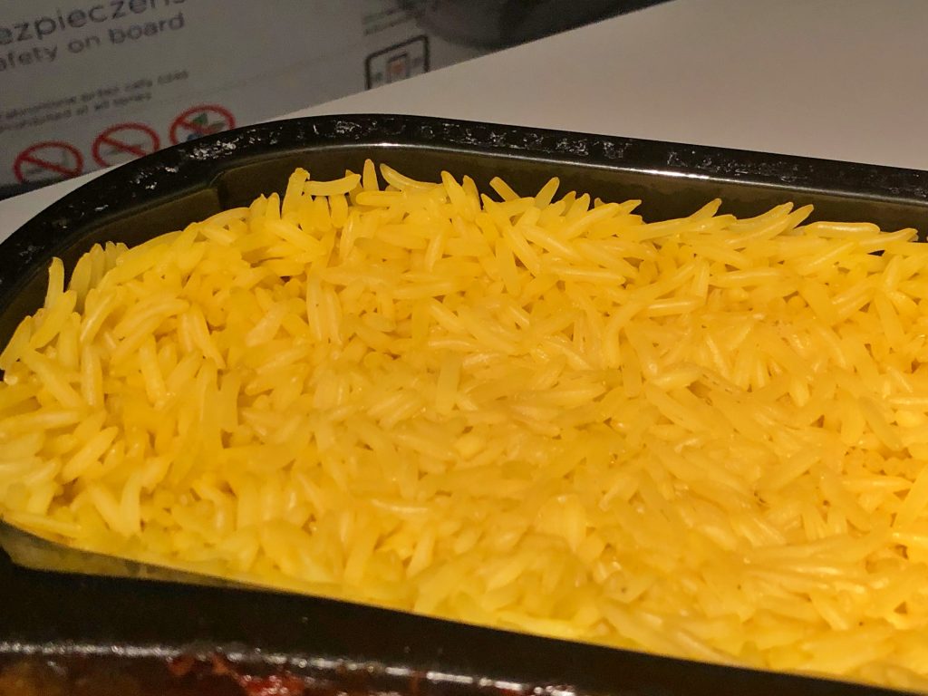 LOT Gourmet – Sky Bar – kurczak tikka masala (kurczak w sosie masala na bazie jogurtu z cebulą i orietalnymi zołami, podawany z żółtym ryżem)