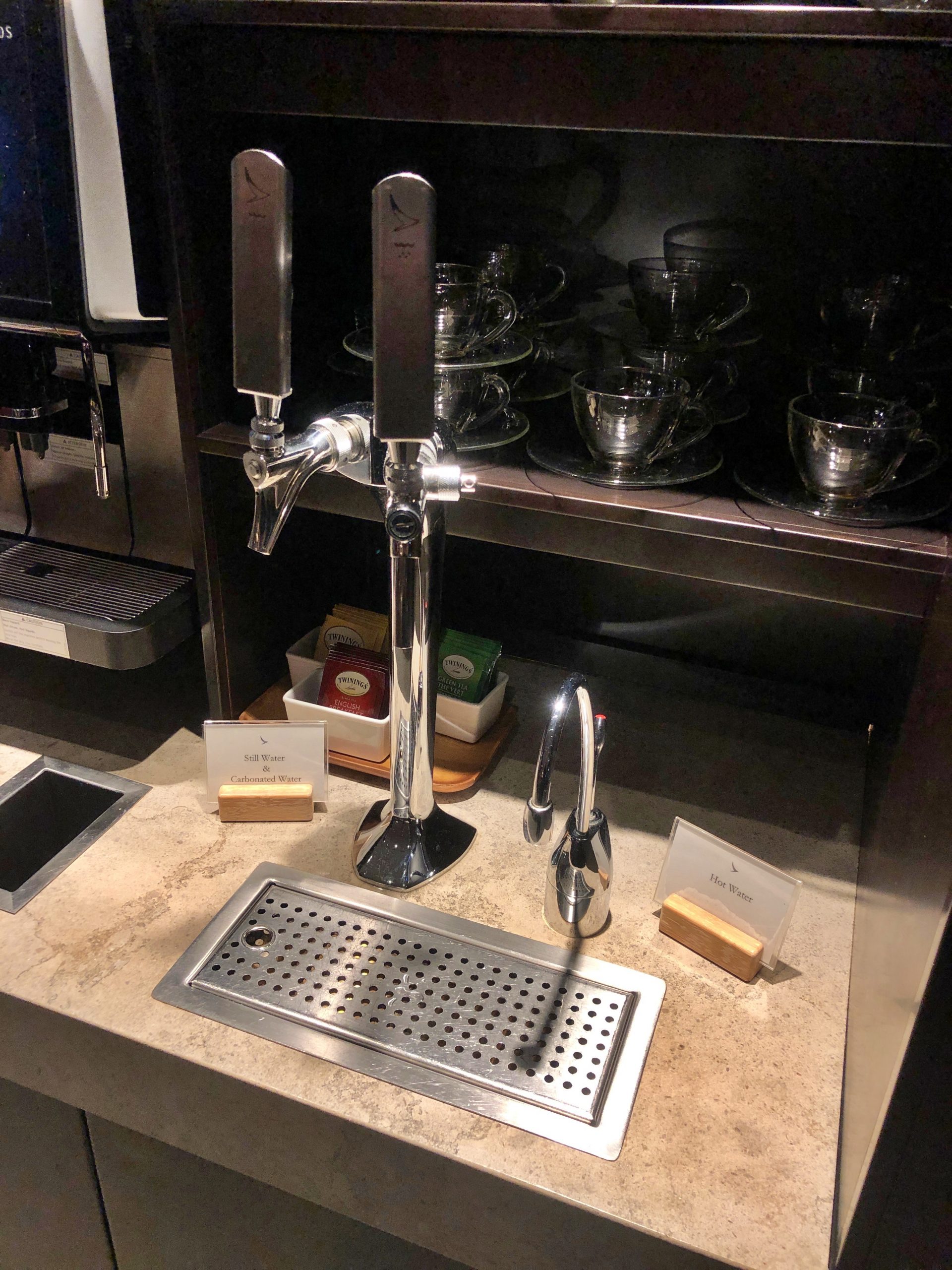 Salonik biznesowy Cathay Pacific Lounge, Vancouver – bufet – dystrybutor wody gazowanej, niegazowanej i wrzątku