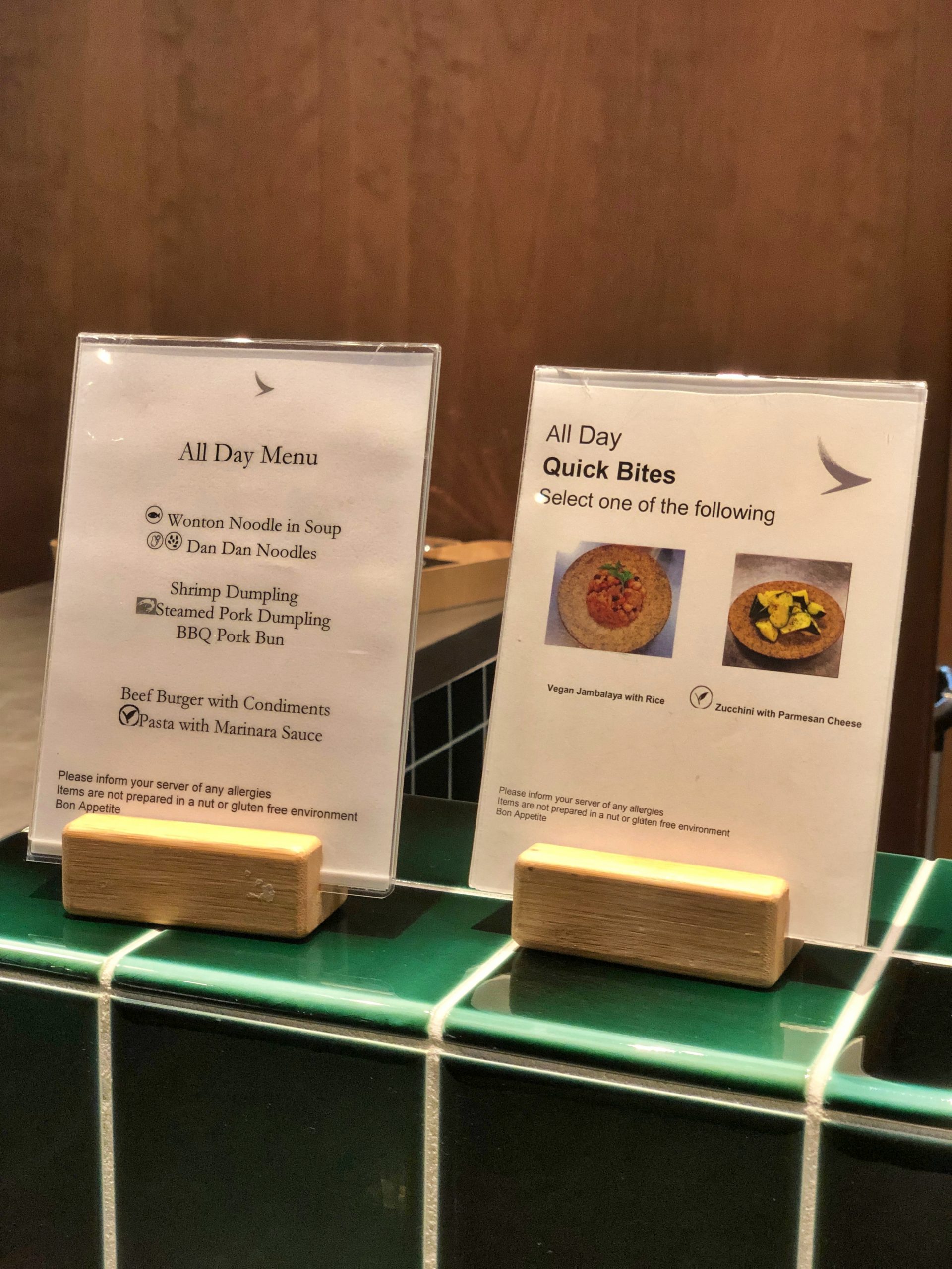 Salonik biznesowy Cathay Pacific Lounge, Vancouver – signageSalonik biznesowy Cathay Pacific Lounge, Vancouver – menu Noodle BarSalonik biznesowy Cathay Pacific Lounge, Vancouver – część restauracyjna, w tle Noodle BarSalonik biznesowy Cathay Pacific Lounge, Vancouver – system przywoławczy Noodle BarSalonik biznesowy Cathay Pacific Lounge, Vancouver – Wontony w zupie, Dan Dan noodles z dodatkamiSalonik biznesowy Cathay Pacific Lounge, Vancouver – Noodle Bar – BBQ Pork Bun i burger wołowy z dodatkami