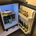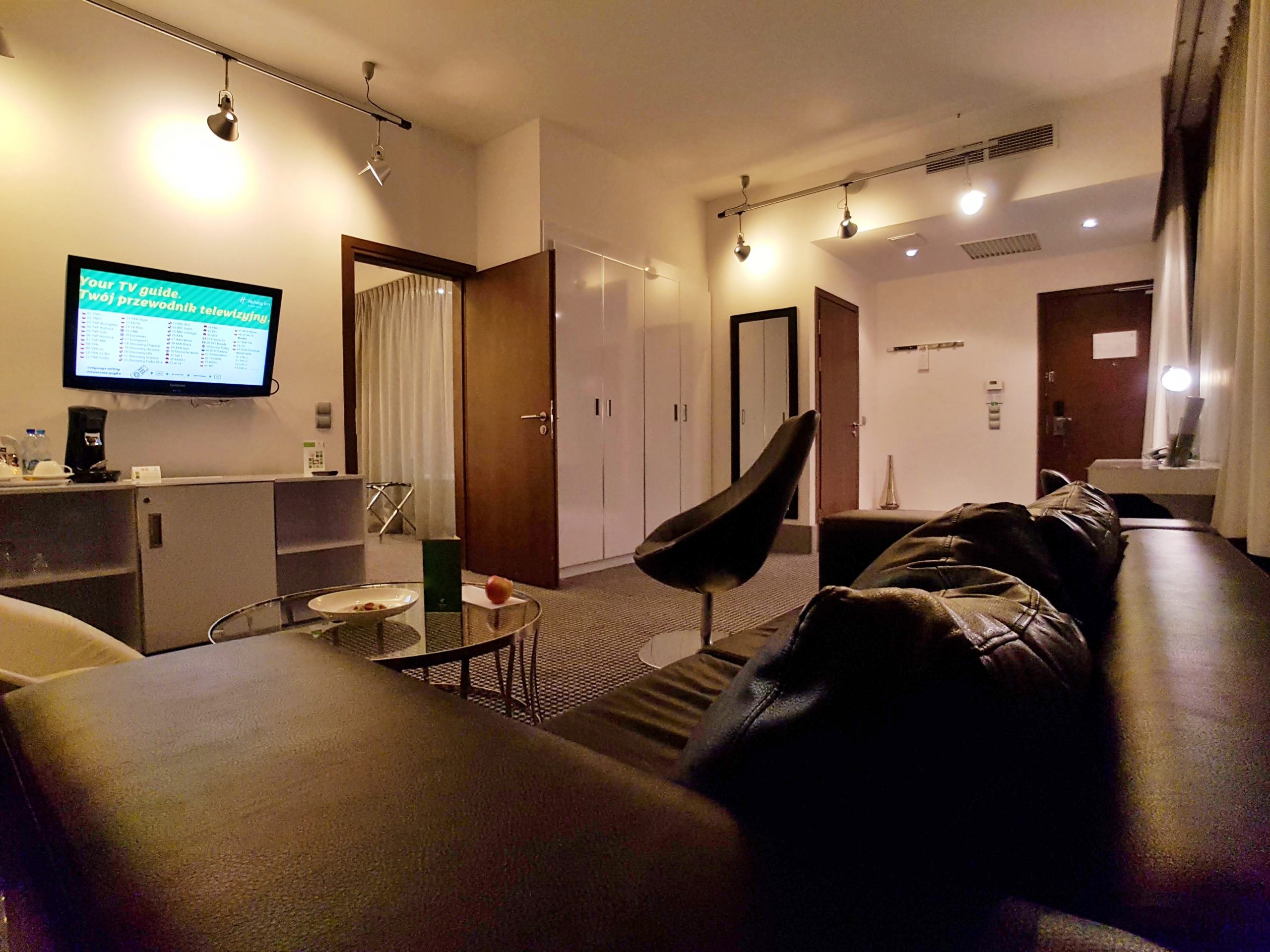 Na trzecim piętrze, na końcu korytarza, znajduje się nasz pokój – apartament o numerze 335. Pierwsze wrażenie? Usytuowany na rogu budynku pokój dzienny, do którego prowadzą drzwi z zewnątrz jest wielki. Mieliśmy okazję spać w wielu hotelach marki Holiday Inn, ale pokoje wielkości tego dziennego w Bydgoszczy spotykaliśmy jedynie w kilku hotelach w USA. Wyposażenie pokoju w znaczącej części jest monochromatyczne – jasne biurko z funkcją toaletki, szafa i komoda, czarna, skórzana kanapa, fotele w kombinacji białej i czarnej. Mimo nie najnowszego stylu, wszystkie przedmioty są zadbane, czyste i wygodne. No i ta przestrzeń! Na stoliku kawowym stojącym obok kanapy i foteli, znajdujemy wstawkę powitalną oraz list powitalny. Na komodzie pod telewizorem umieszczono zestaw do parzenia kawy i herbaty, ekspres do kawy, a także nieźle jak na hotel tej klasy wyposażony minibar.