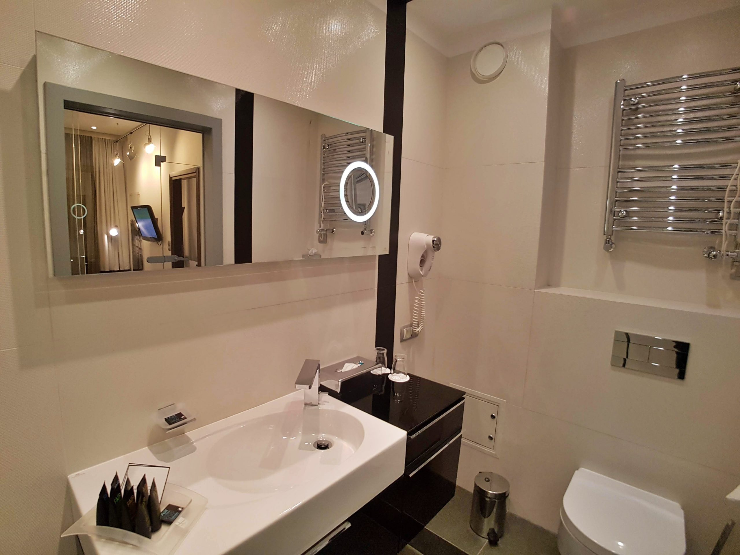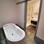 Łazienka składa się z dwóch pomieszczeń. Pierwszym z nich jest wspomniane już, przeszklone z jednej strony miejsce z wanną. Drugie skrywa zaś wygodny prysznic typu walk-in, umywalkę z wielkim lustrem i rozległą przestrzenią blatu, oraz toaletę.