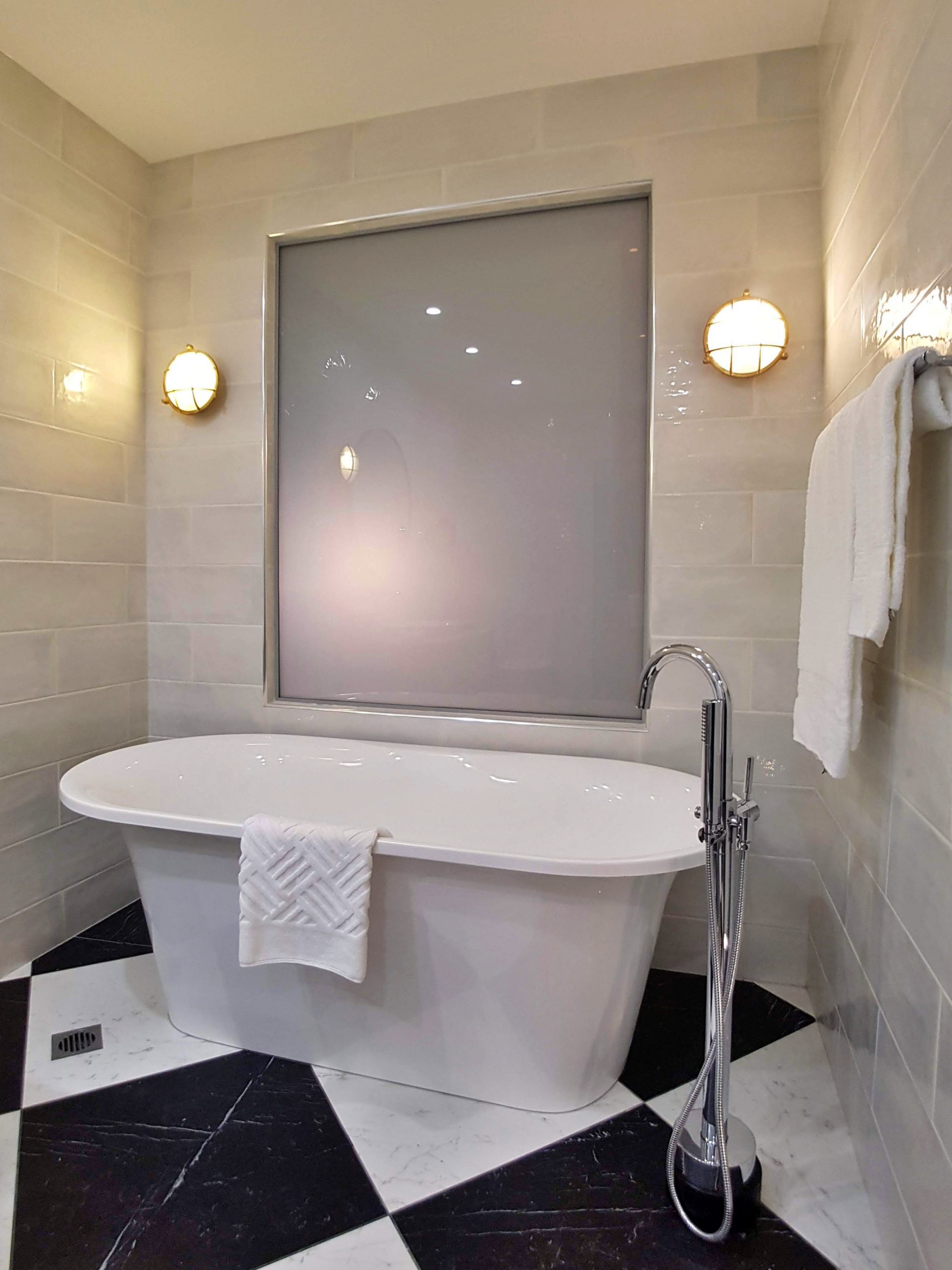 Bardzo dobre wrażenie robi również wspomniana wcześniej łazienka, utrzymana w jasnych barwach, z „szachownicą” na podłodze. Jak przystało na pokój najwyższej kategorii, oferuje ona komplet udogodnień – jest tu więc zarówno piękna, wolnostojąca wanna jak i przeszklony prysznic. Centralnym elementem jest natomiast spora umywalka z blatem i okrągłym lustrem. Rzeczą, która zwróciła naszą uwagę niemal natychmiast, była miękkość i świeżość bielizny łazienkowej udostępnianej Gościom – niestety, takie przyjemności dostępne są zazwyczaj jedynie w drogich lub nowo otwartych hotelach.