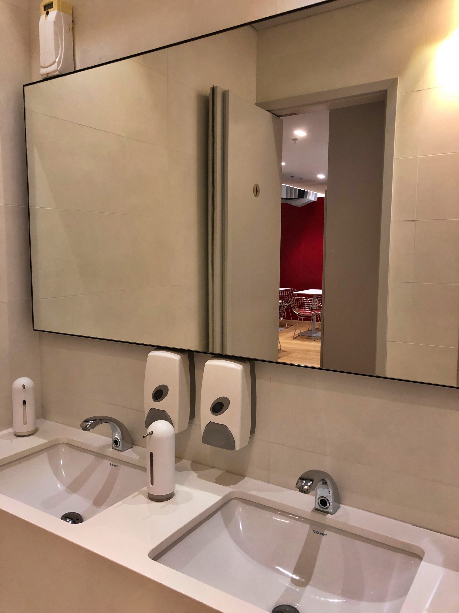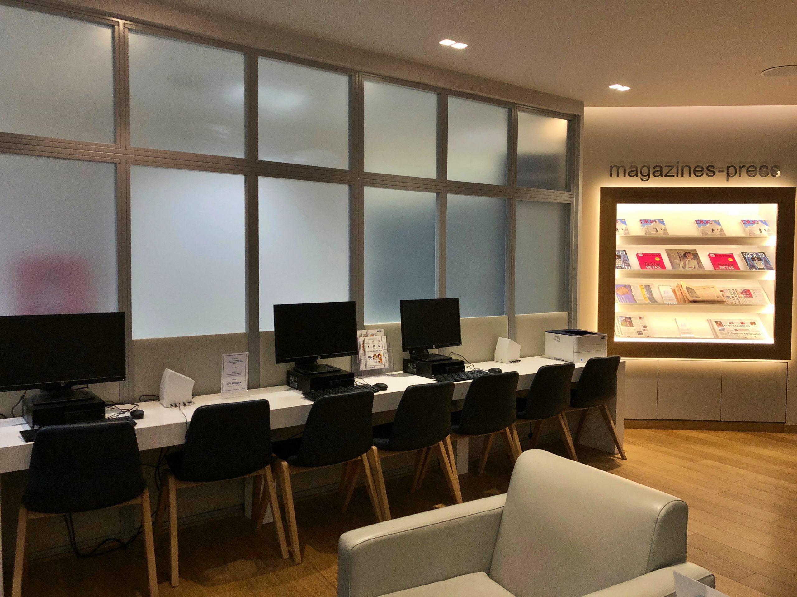 Po wejściu do lounge’a od razu zauważamy dużą przemianę. Przede wszystkim stare, ciemne meble zostały zastąpione sofami i fotelami w kolorze ecru, a także jasnymi stolikami. Zastosowano jasne kolory ścian, które podkreślono ciepłym oświetleniem. Pomieszczenie podzielono funkcjonalnie na kilka stref. Największa z nich to wygodna strefa wypoczynkowa. Podróżni często korzystający z saloników linii Lufthansa odnajdą tu wiele podobieństw. Stoliki, przy fotelach i dwuosobowych sofach, wyposażono w gniazdka elektryczne dla wygody. Dodatkowo, w strefie przeznaczonej do pracy udostępniono adaptery do ładowania różnych typów sprzętów mobilnych. Do dyspozycji podróżnych przeznaczone są również trzy komputery stacjonarne oraz drukarka.