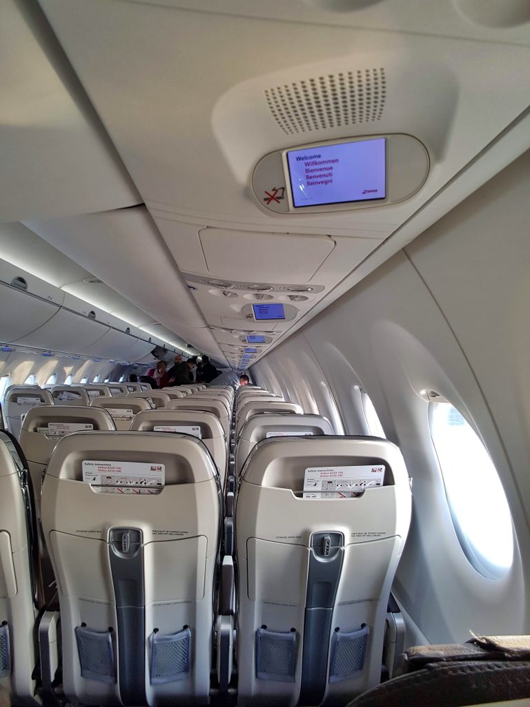 SWISS – Klasa Ekonomiczna w Airbus A220 Warszawa – Zurych – kabina – siedzenia („trójka”)