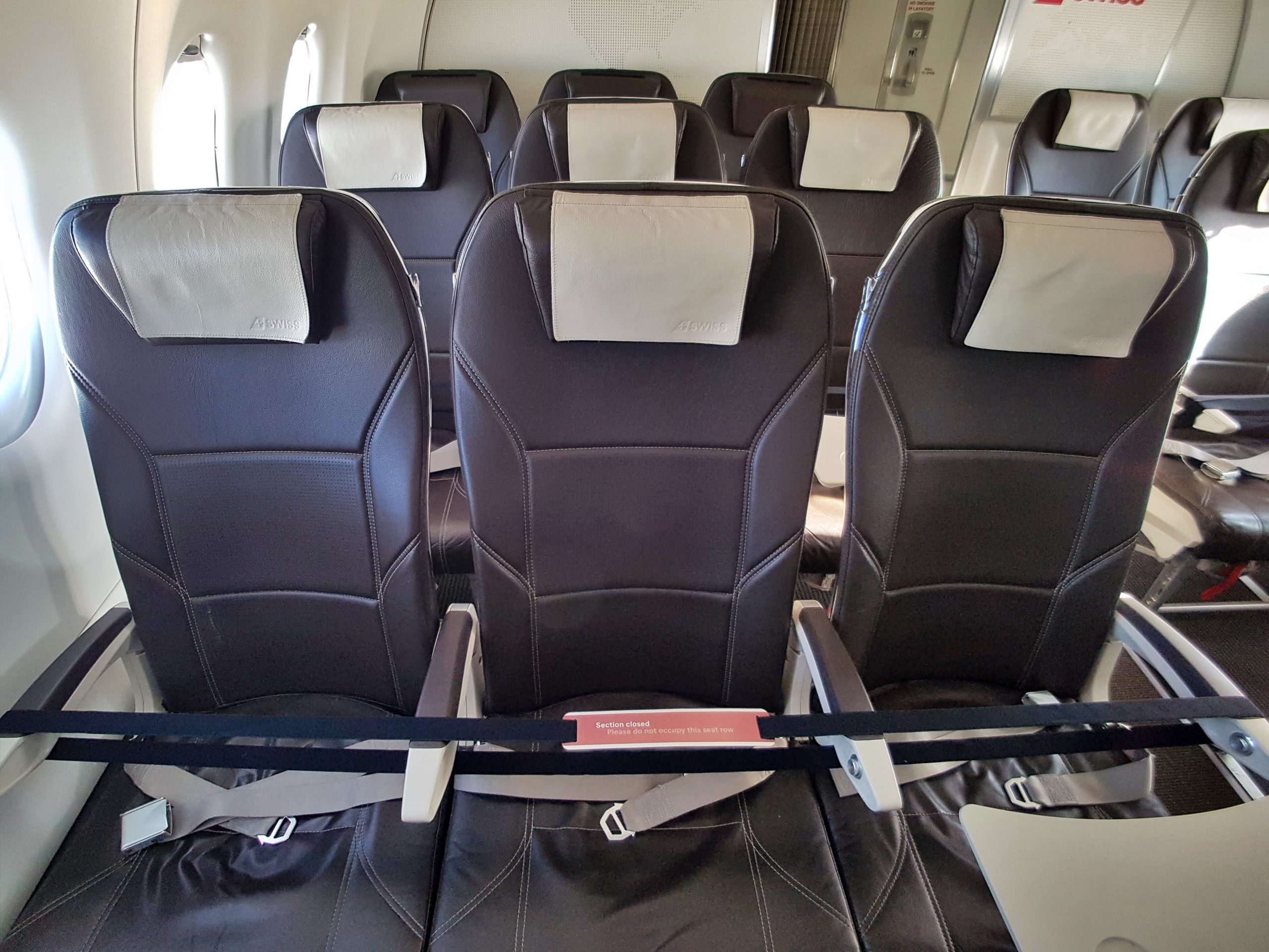 SWISS – Klasa Ekonomiczna w Airbus A220 Warszawa – Zurych – kabina – zablokowane ostatnie rzędy