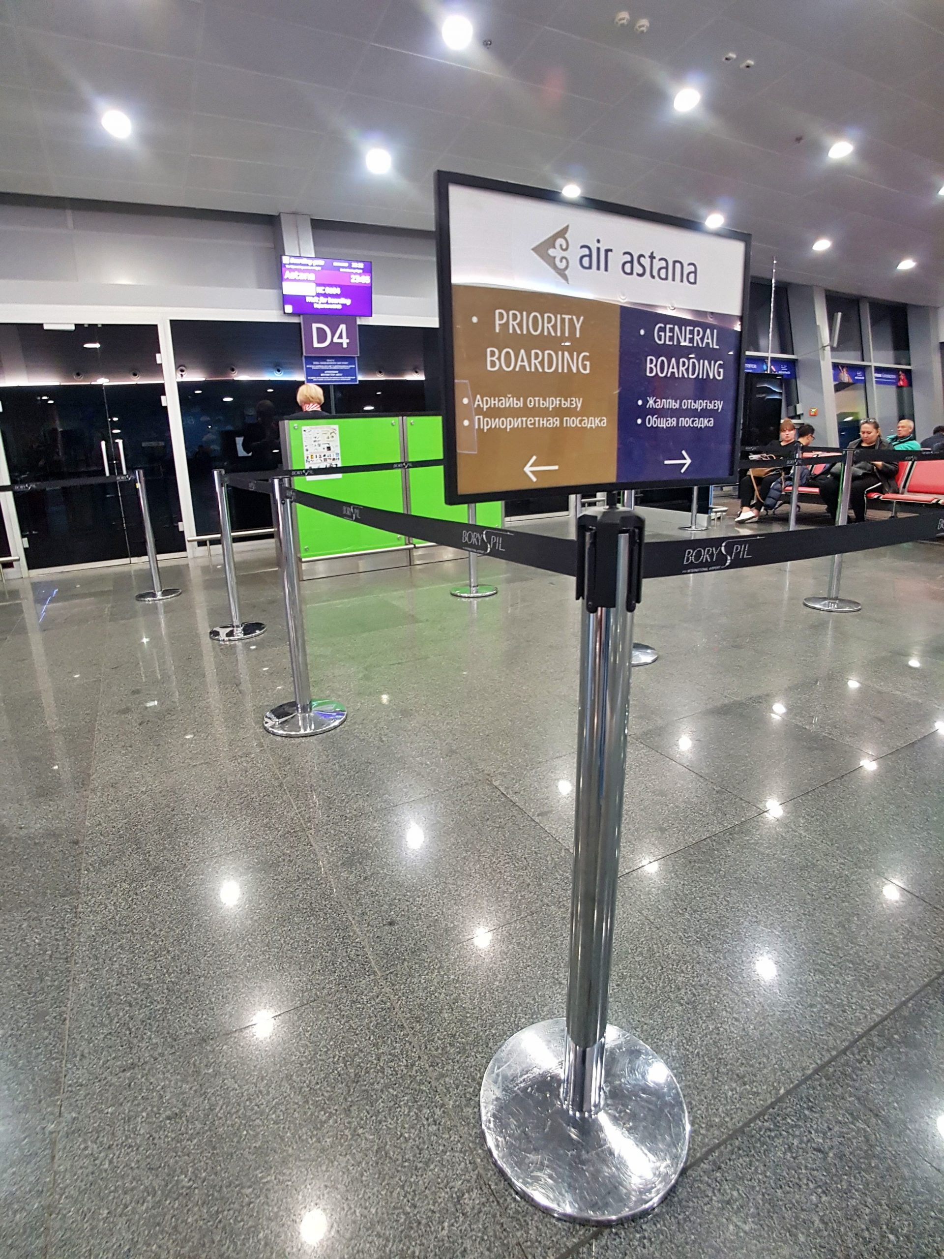 Do Kijowa dotarliśmy samolotem LOTu dzień wcześniej, noc spędziliśmy w hotelu, a kiedy zbliżał się czas otwarcia stanowisk odprawy bagażowej, wsiedliśmy w pociąg, który zawiózł nas bezpośrednio na kijowskie lotnisko Boryspol (KBP). Odprawa przy stanowisku dedykowanym dla pasażerów klasy biznes, oraz pasażerów statusowych programu lojalnościowego linii była sprawna i bezproblemowa. W czasie jej trwania otrzymaliśmy karty pokładowe na lot z Kijowa do Nur Sułtanu (dawniej Astany), oraz odcinek krajowy z Nur Sułtanu (Astany) do Ałmat. Po kartę pokładową na kolejny lot – do Bangkoku, mieliśmy zgłosić się na lotnisku w Nur Sułtanie (Astanie) bądź w Ałmatach. Otrzymaliśmy również zaproszenie do saloniku biznesowego na kijowskim lotnisku – liniia Air Astana wysyła swoich pasażerów do lounge Mastercard.