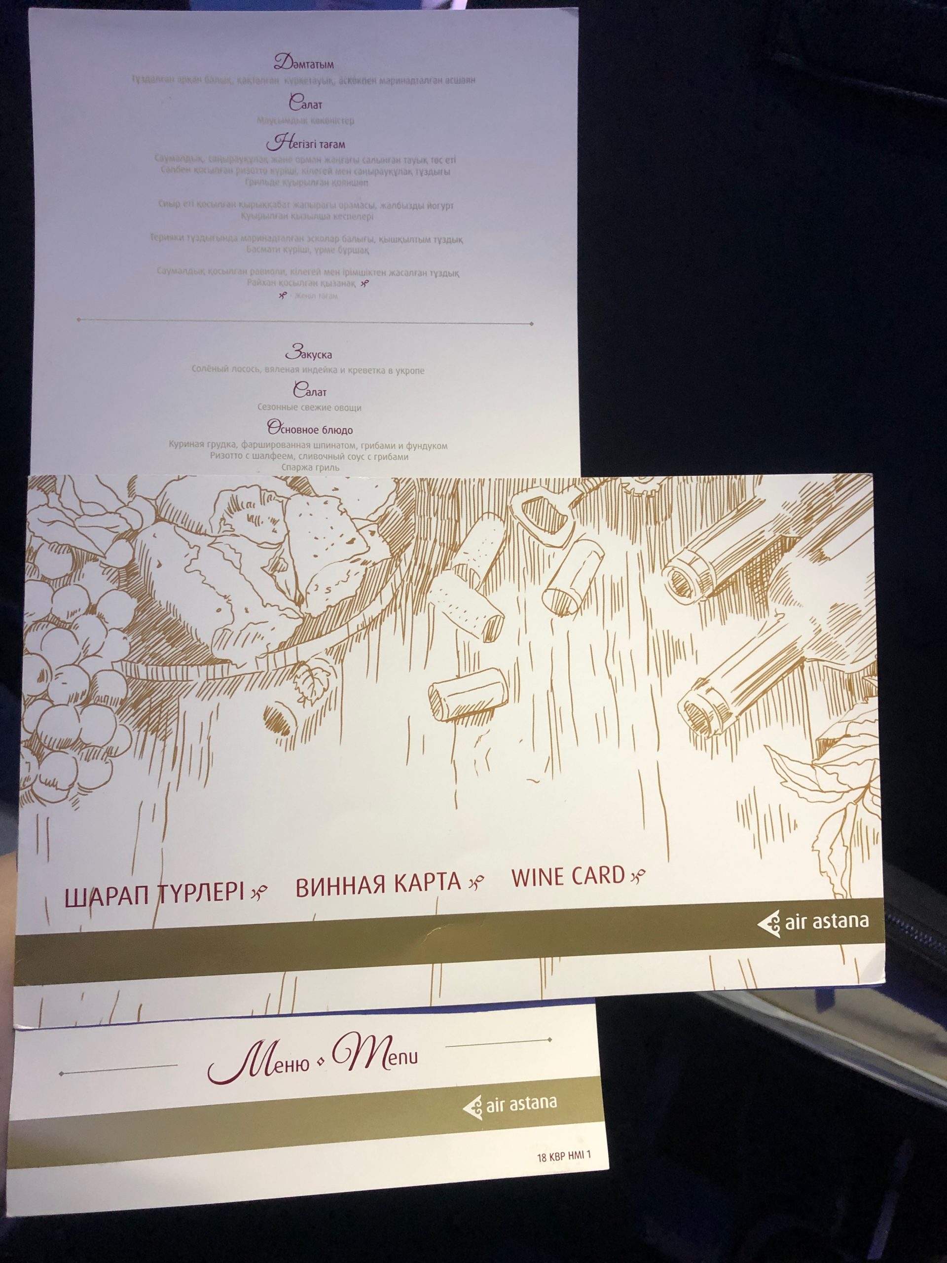 Po napojach Stewardesy roznoszą kosmetyczki podróżne (amenity kit) co jest dla nas pewnym zaskoczeniem na tak krótkim locie, a także wybór kazachskiej, ukraińskiej oraz międzynarodowej prasy i magazynów. Kiedy w samolocie znajduje się już większość pasażerów, Stewardesy roznoszą pasażerom klasy biznes menu oraz karty win i napojów.