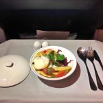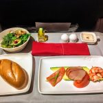 Na przystawkę podano prostą sałatkę z ogórkiem, serem typu feta, orzechami włoskimi, granatem i mieszanką sałat. Było to jedno z najlepszych tego typu dań, jakie jedliśmy w samolocie od niepamiętnych czasów. Do tego wybór protein – nadużywany niemal do znudzenia wszędzie wędzony łosoś, tym razem w jędrnej, smacznej wersji, do tego, aromatyczny, wędzony indyk, oraz jędrna, niemal chrupiąca, wielka krewetka marynowana w sosie teriyaki.