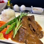 Jako przystawkę tym razem zaserwowano pyszną pierś z kaczki, serek z orzechami i brzoskwiniami oraz baba ganoush. Wszystko smaczne. Bardzo przypadła nam też do gustu sałatka z buraka i marchewki – wreszcie coś poza lotniczy schemat! Świetnym uzupełnieniem przystawki było pieczywo czosnkowe, oraz pyszne, świeże bułeczki, zupełnie nieprzypominające standardowego, gumowego pieczywa podawanego w samolotach.