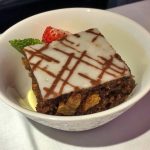 My zdecydowaliśmy się tym razem na fondant czekoladowy z bitą śmietną, oraz świeże owoce. Do tego kawa i herbata. Ciekawostką jest, że jako jeden z wariantów słodyczy do wszystkich ciepłych napojów zawsze na lotach Air Astana podawano kazachski miód.