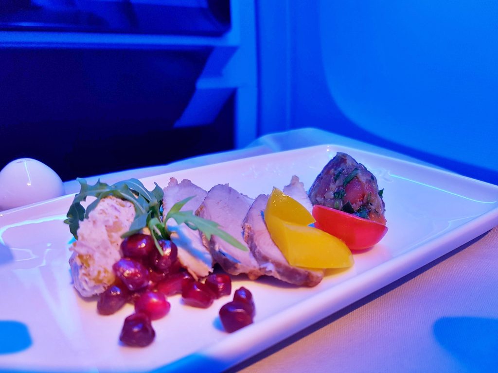 Air Astana – Klasa Biznes w Boeing B767 Almaty – Bangkok – przystawka – wędzona pierś z kaczki, baba ganoush, serek z brzoskwinią i orzechem włoskim, granat, pomidorek, papryka
